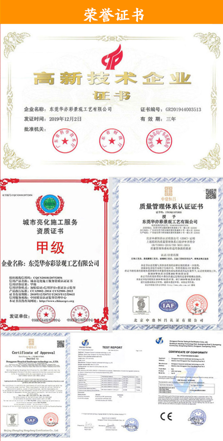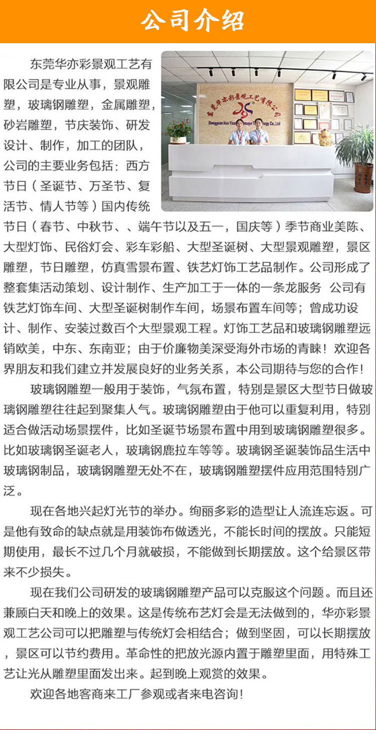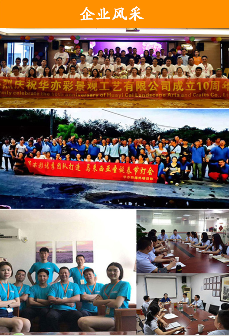 国家高新技术企业东莞华亦彩景观工艺有限公司,灯饰源头工厂,承接传统彩灯花灯制作,提供一站式灯饰工程解决方案,灯会灯展策划筹备运营;我们有研发,策划设计、制作安装,灯展运营的团队!主要业务包括:花灯制作、灯饰工程、民俗灯会、彩车彩船、大型圣诞树、景观雕塑;仿真雪景布置、商业美陈、铁艺灯饰工艺品制作。公司传统花灯工艺品更是远销欧美、中东、南美及东南亚;由于工艺精湛服务周到深受海外市场的青睐!欢迎各界朋友和我们建立并发展良好的业务关系,本公司期待与您的合作!我们愿去到全国乃至全球任何一个地方,为客户量身现场制作。这些年我们服务足迹几乎遍布所有建交的国家和地区。积累了丰富的外出制作经验和进出口、以及沟通交流、涉外合作的经验。强大的企划设计团队,免费为客户提供专属的设计方案,出具直观的效果图。强大的制作、安装、维护以及灯展运营团队为客户落地精益求精的项目工程。在技术团队配备上我们有技术总监、大美、雕塑师、造型师、钳工,焊工、喷涂工、电工、裱绣工、美工、画工、模具工、每一个工种负责不同的工艺。完整的工种配备使我们有信心不负每一位客户的信赖。俗话说术有专攻,要想把工艺做好要好的团队通力协作才能完成;智慧的您选择我们是明智之选。
