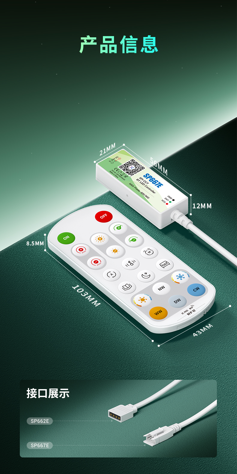 深圳市斯泊尔光电科技有限公司(以下简称“斯泊尔”)是一家集自主研发、销售、服务于一体的智能LED控制系统的专业型公司,是极具有创新力的LED灯光控制的方案提供商,多年来,斯泊尔开发的SP系列LED控制器以优良的质量,稳定的软件硬件结合,还有不断的创新,深受国内外客户的喜爱。斯泊尔为用户提供多样化的智能灯光解决方案。基于先进的无线RF,蓝牙,WiFi,IoT等技术,开发出了设计精良、性能卓越、更为智能的智能灯光控制系统,产品线覆盖了RF/IR遥控控制器,蓝牙控制器,WiFi控制器,还有实现了与阿里、小米、亚马逊、Google等物联网平台云对接的IoT控制器,智能ArtNet控制器等等...我们秉持“工匠”精神,通过提供性能卓越的智能硬件,和完整丰富的软件解决方案,帮助客户快速实现灯光产品智能化,正因如此,斯泊尔的产品越来越多客户的青睐,被广泛应用于智能家居、智能照明汽车灯光、消费电子等领域。