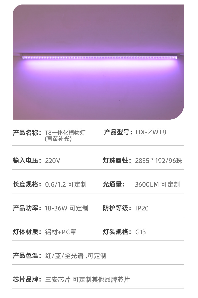 T8一体化植物生长灯管育苗组培灯叶菜18W36WLED植物灯