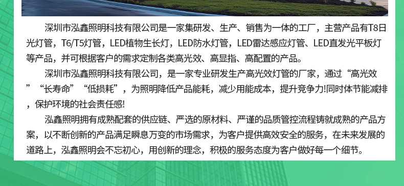 深圳市泓鑫照明科技有限公司是一家集研发、生产、销售为一体的工厂,主营产品有T8日光灯管,T6/T5灯管,LED植物生长灯,LED防水灯管,LED雷达感应灯管、LED直发光平板灯等产品,并可根据客户的需求定制各类高光效、高显指、高配置的产品。 公司招才纳贤,持续创新,客户遍布全球十几个国家及地区,并为行业多家品牌提供OEM和ODM服务。 泓鑫照明拥有成熟配套的供应链、严选的原材料、严谨的品质管控流程铸就成熟的产品方案,以不断创新的产品满足瞬息万变的市场需求,为客户提供高效安全的服务,全面投入社会建设。 在未来发展的道路上,泓鑫照明会不忘初心,用创新的理念,积极的服务态度为客户做好每一个细节。欢迎海内外客户莅临我司参观指导,共筑安全照明新时代。