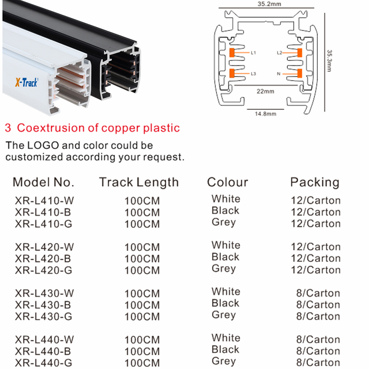 新锐轨道条,采用全新铝材制造,内置全新PC塑胶与铜线一体成型而成,具有铜线与塑胶紧固连接,优异的安全性能,同时导轨与塑胶部分有符合安规的爬电距离,本产品已通过CE,ROHS,TUV等安规认证。适用于各种展厅、博物馆、服装店、陈列室、艺术橱窗灯等各种室内外展示照明的场所。