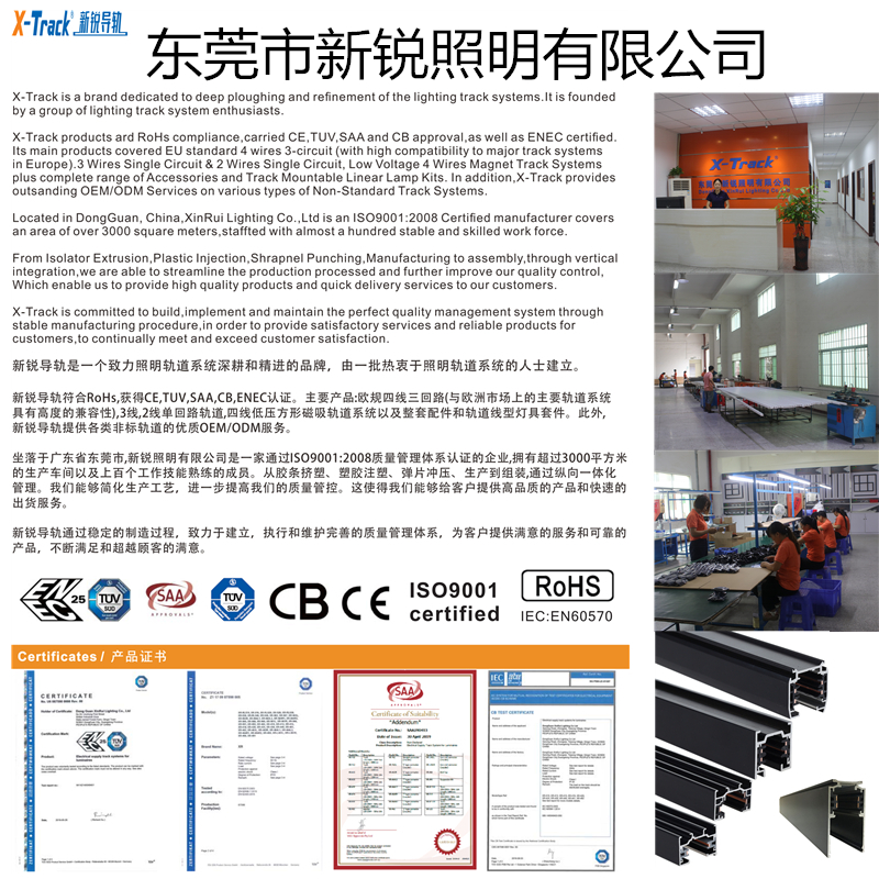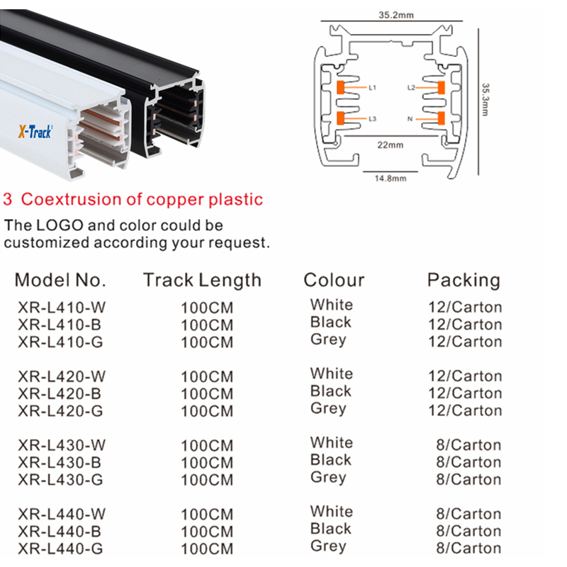 新锐轨道条,采用全新铝材制造,内置全新PC塑胶与铜线一体成型而成,具有铜线与塑胶紧固连接,优异的安全性能,同时导轨与塑胶部分有符合安规的爬电距离,本产品已通过CE,ROHS,TUV等安规认证。适用于各种展厅、博物馆、服装店、陈列室、艺术橱窗灯等各种室内外展示照明的场所。
