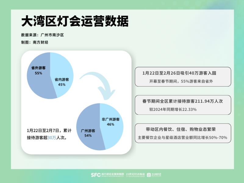 这是一次最新的文化赋能文旅经济、塑造城市IP的成功探索样本:短短15天内,这场极具本土味、国际范、科技感和沉浸式色彩的“超级灯会”,吸引了超过30万名游客前来“打卡”,领略岭南之韵、湾区之美、中华之盛,并带动春节期间南沙主要餐饮企业和星级酒店营业额同比增长50%-70%。从1月22日至3月4日,粤港澳大湾区灯会累计吸引近50万游客入园。