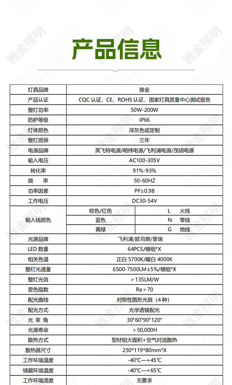 浙江雅金照明科技有限公司是专业从事LED灯具的设计、生产、销售、维护并提供照明工程和节能改造工程解决方案的照明灯具企业。雅金照明拥有比较完善的灯具产品设计、生产、测试老化、成品包装出库,和多种技术人员组成的一个复合型协作团队。 雅金照明产品有LED工矿灯,LED投光灯,LED路灯,LED球场灯,LED加油站灯,LED防爆灯,LED隧道灯等室内外照明灯具系列。雅金照明生产的产品广泛应用 于各种车间、厂房、仓库、高棚、运动场、车库、停车场、煤场、造船厂、矿山、收费站、加油站、超市、展馆、办公楼、学校、别墅、道路交通、广场公园、车 站、码头等场所所需的建筑照明,景观照明,商业照明。 雅金照明承接OEM业务,同时根据客户的个性需求,进行研发设计,使产品更符合客户和市场的需求。