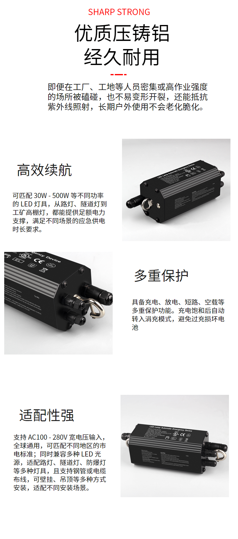 深圳市登峰电源有限公司 专注led应急电源、LED特种照明,集研发生产、销售服务与一体,生产LED应急电源、LED应急灯、多功能应急电源、智能调光LED应急电源、一体化应急电源、日光灯应急电源等各种照明应急电源、应急照明灯具、应急灯电池组等,在应急照明领域独树一帜。公司拥有完善的生产工艺和精良的检测设备,产品设计新颖高雅、简洁实用、安装方便。采用进口芯片,具有高效率、长寿命、节能环保等诸多优势。本公司研发生产的LED应急光源,电路设计科学,市电应急两用,国际电路、自动切换、多重保护功能。产品通过CE 、FCC、LVD、UL、ROHS等诸多检测认证;本公司LED应急灯及多功能LED应急电源,行销欧美、英国、台湾、香港、新加坡、澳洲、迪拜、日本等多个国家和地区,并获得一致好评。 现代商业活动对安全照明提出了更高要求,登峰电源响应时代和行业的发展需求,将保障人类安全照明作为矢志不渝的事业。提供系统化安全照明解决方案的专业企业。登峰电源强调以满足客户现有需求、引导未来应用趋势为中心,将产品功能、外观造型、质量保证融为一体,进行产品的系列化研发,以先进的安防照明产品,服务于人类生活。LED应急照明产品主要应用公共场所的安全应急照明,如地下停车场、地铁、大型商场、饭店、高档办公楼宇等。本公司生产的LED应急灯系列产品以高效率、长寿命、安全可靠等良好性能羸得广大客户的信赖。公司以顾客满意为经营宗旨,营造以人为本、诚信务实的企业文化,致力打造高质量、高信誉的企业形象。 倡导绿色环保、安全节能之理念,并为之不懈努力!