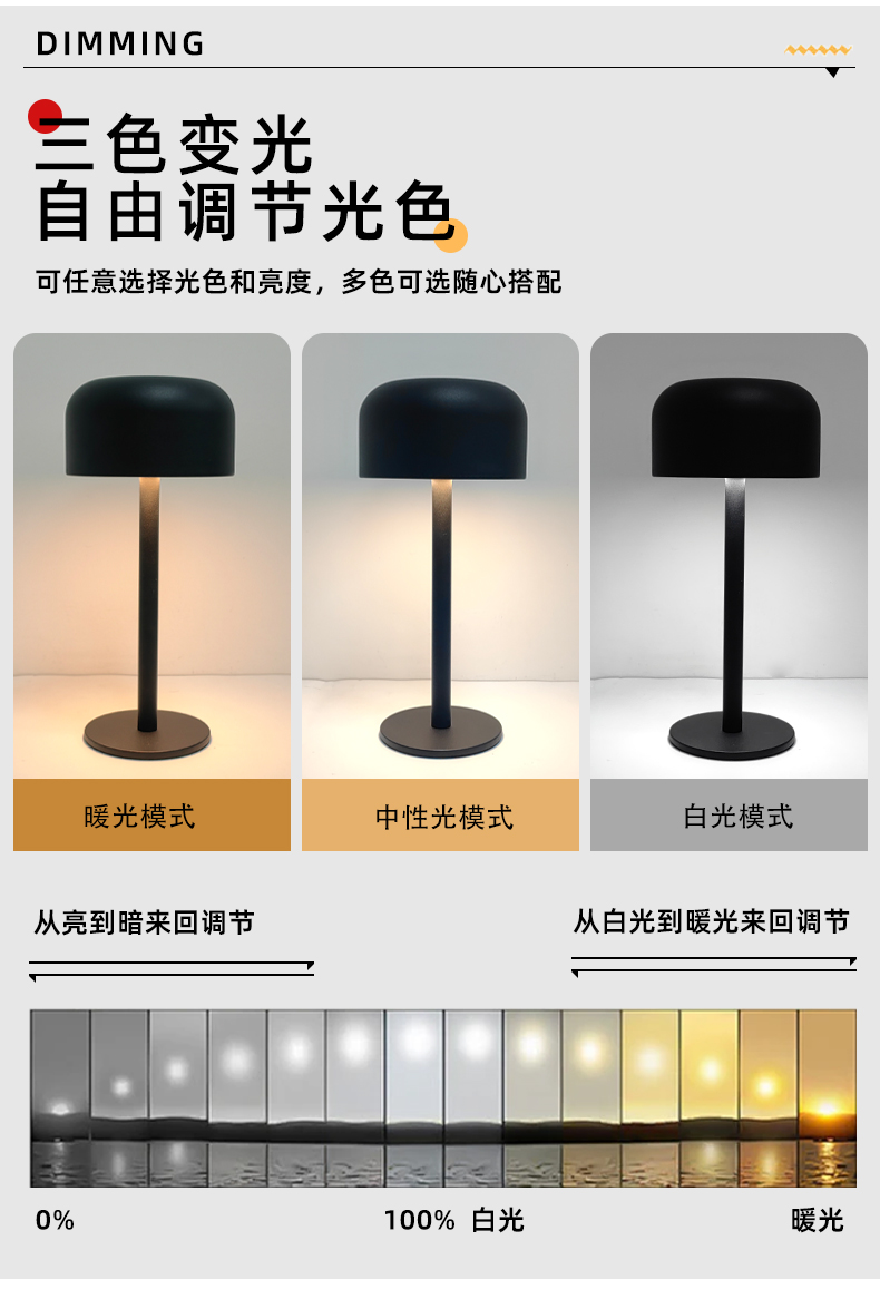• 光源可调性 亮度调节、色温调节