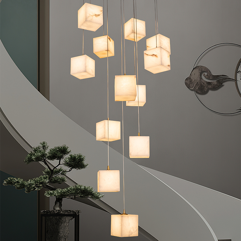 现代简约别墅旋转楼梯云石吊灯Loft复式楼客厅大气方形吊灯