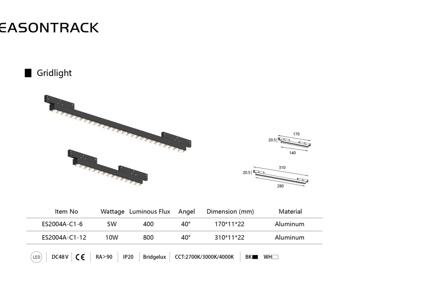 ES2004A-C1-6 | 5W | 400 | 40° | 2700K/3000K/4000K | 170*11*22mm |
