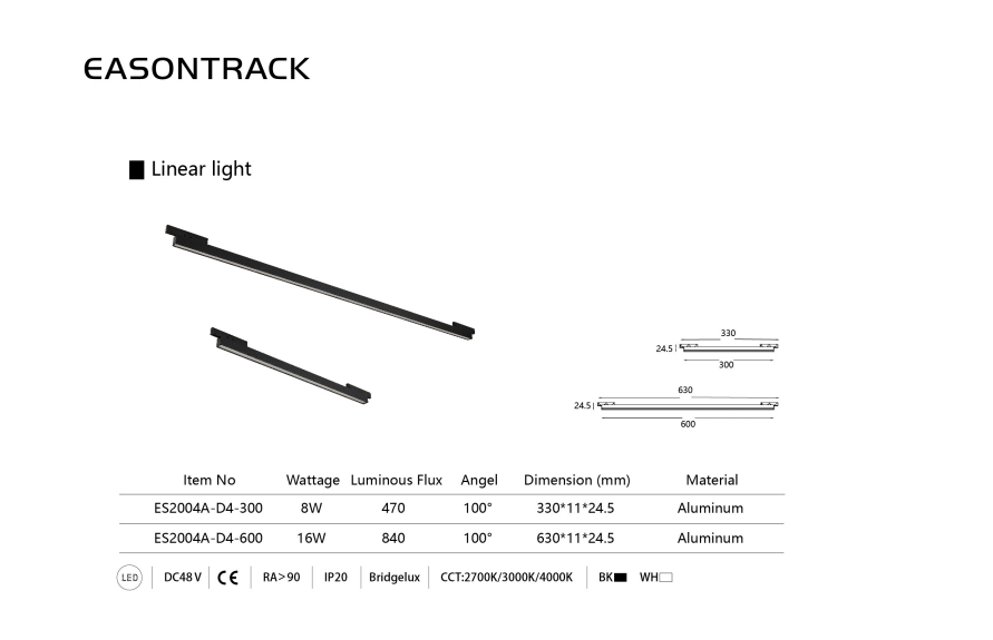 ES2004A-D4-300 | 8W | 240 | 100° | 2700K/3000K/4000K | 330*11*24.5mm |