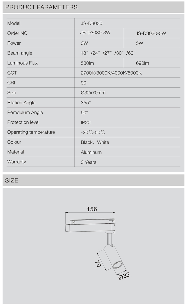 JS-D3030 | 3W/5W | 2700K/3000K/4000K/5000K | 18°/24°/27°/30°/60° | 32*70mm |