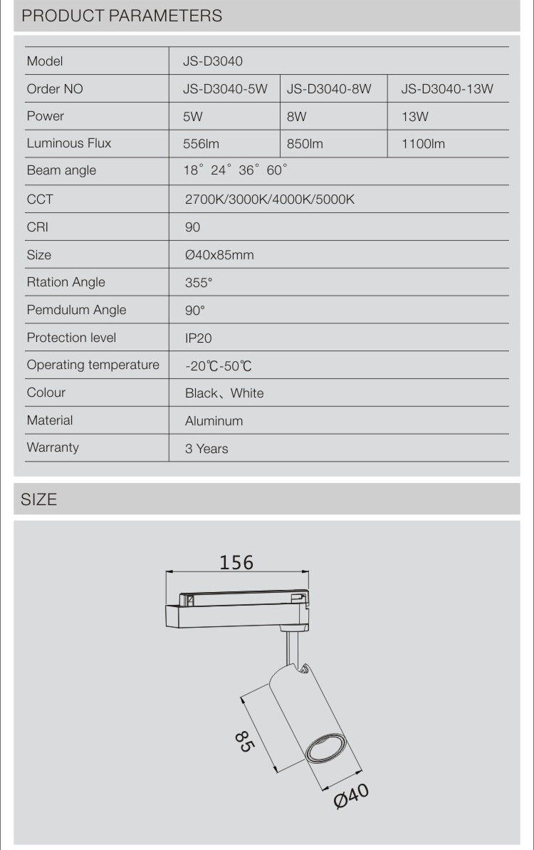 JS-D3040 | 3W/5W/8W | 2700K/3000K/4000K/5000K | 18°/24°/36°/60° | 40*85mm |