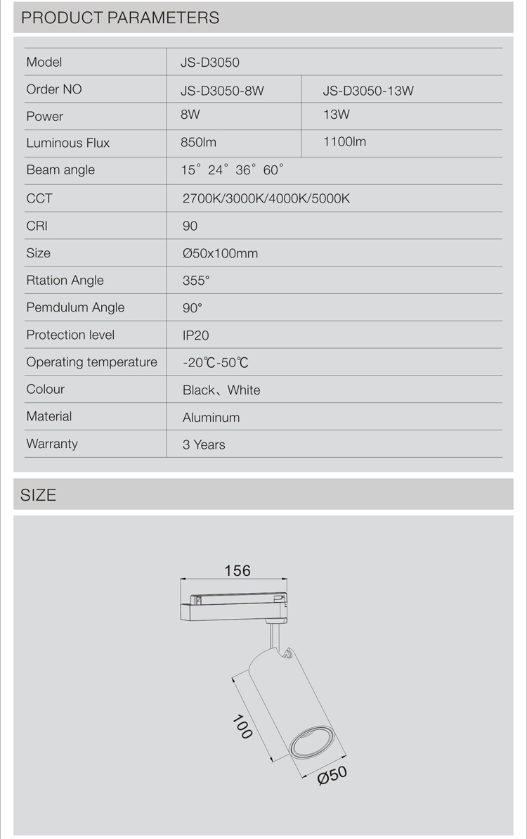 JS-D3050 | 8W/13W | 2700K/3000K/4000K/5000K | 15°/24°/36°/60° | 50*100mm |