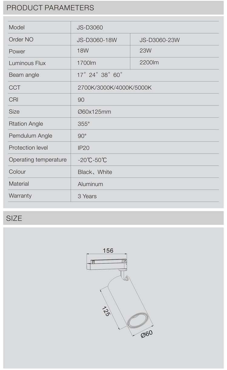 JS-D3060 | 18W/23W | 2700K/3000K/4000K/5000K | 17°/24°/38°/50° | 60*125mm |