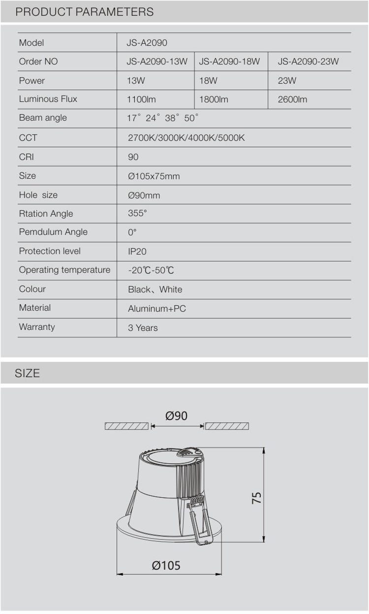 JS-A2090 | 13W/18W/23W | 17°/24°/38°/50° | 2700K/3000K/4000K/5000K | 105*H75mm |