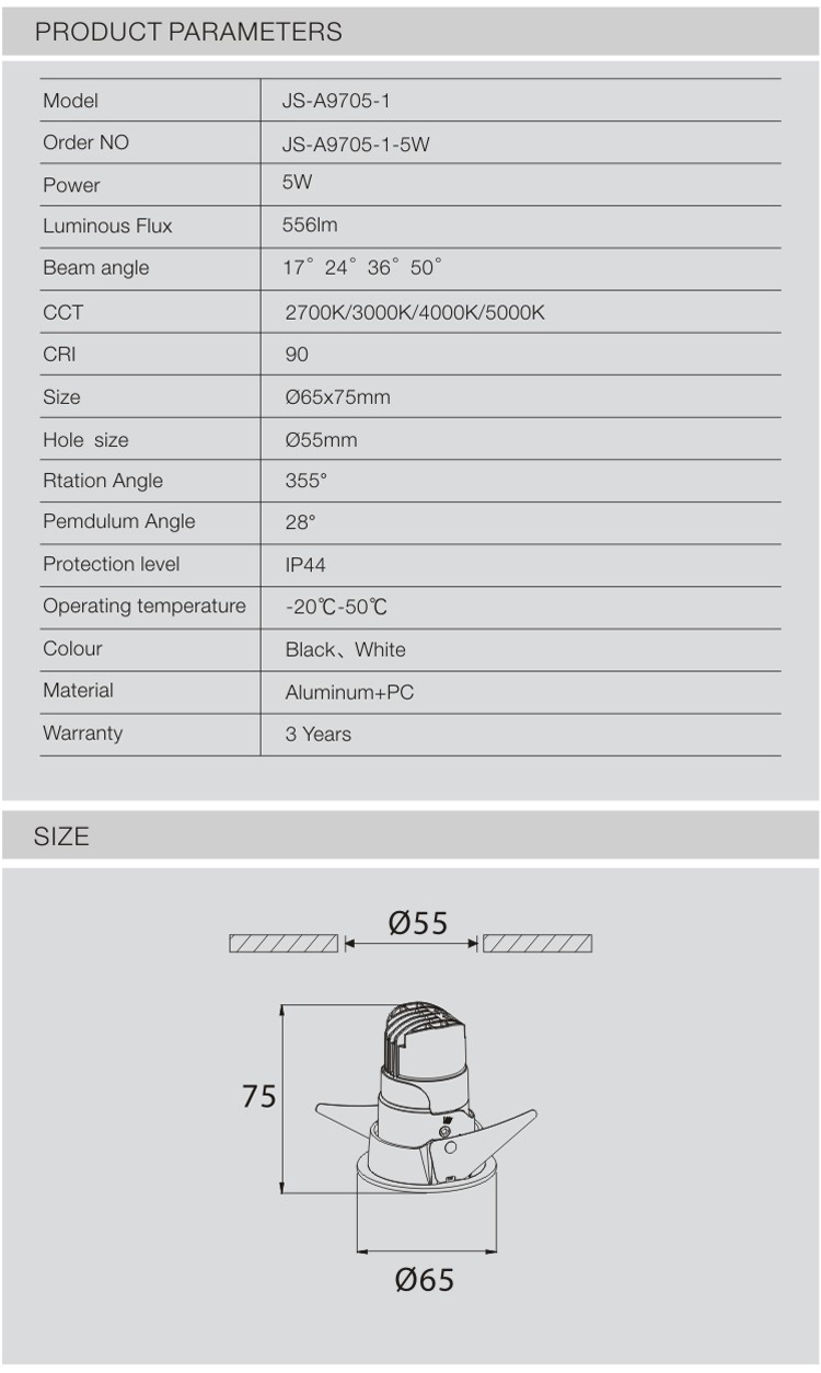 JS-A9705-2 | 5W | 17°/24°/36°/50° | 2700K/3000K/4000K/5000K | 65*H75mm |