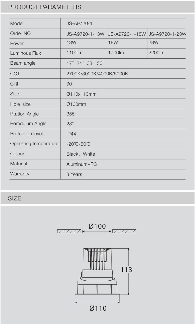 JS-A9720-2 | 13W/18W/23W | 17°/24°/38°/50° | 2700K/3000K/4000K/5000K | 110*H113mm |