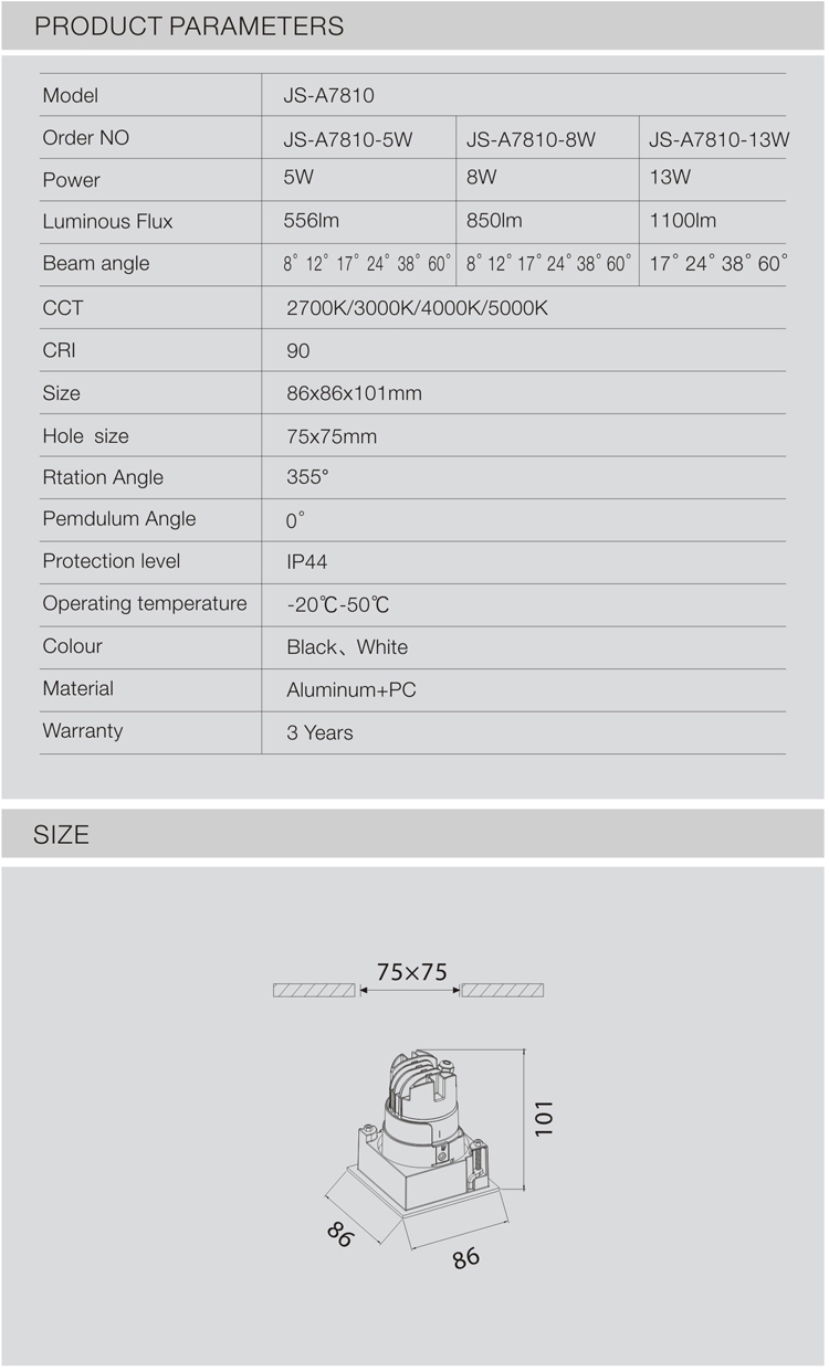 JS-A7810 | 5W/8W/13W | 17°/24°/38°/60° | 2700K/3000K/4000K/5000K | 86*86*H101mm |