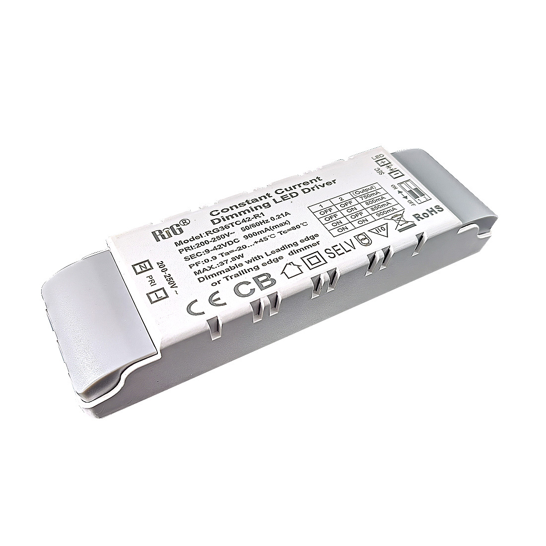 RG12TC42-R1是一款可以提供750/800/850/900mA四档电流的LED调光驱动。这款驱动支持前沿切相和后沿切相调光器,可以兼容多品牌系统(飞利浦,ABB,路创,西门子,西蒙,松下等)配合使用,实现平滑调光的效果。