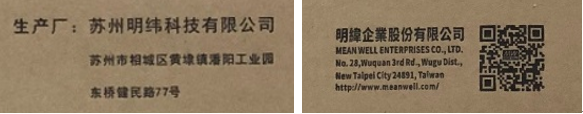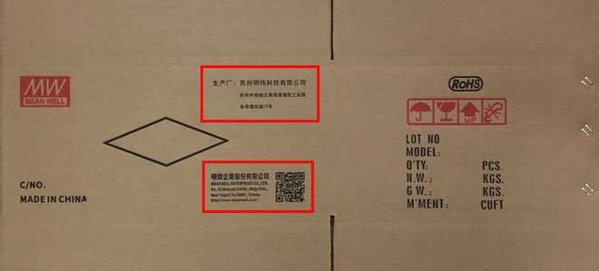 (明纬产品包装箱上标示有明纬生产厂信息、明纬公司信息及官网链接、二维码链接信息)