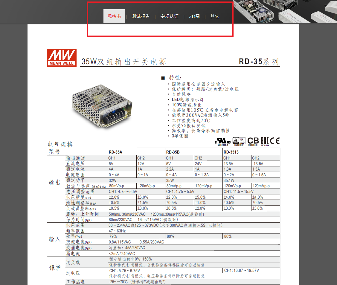 (明纬官网上可找到产品规格书、测试报告、安规认证等信息)