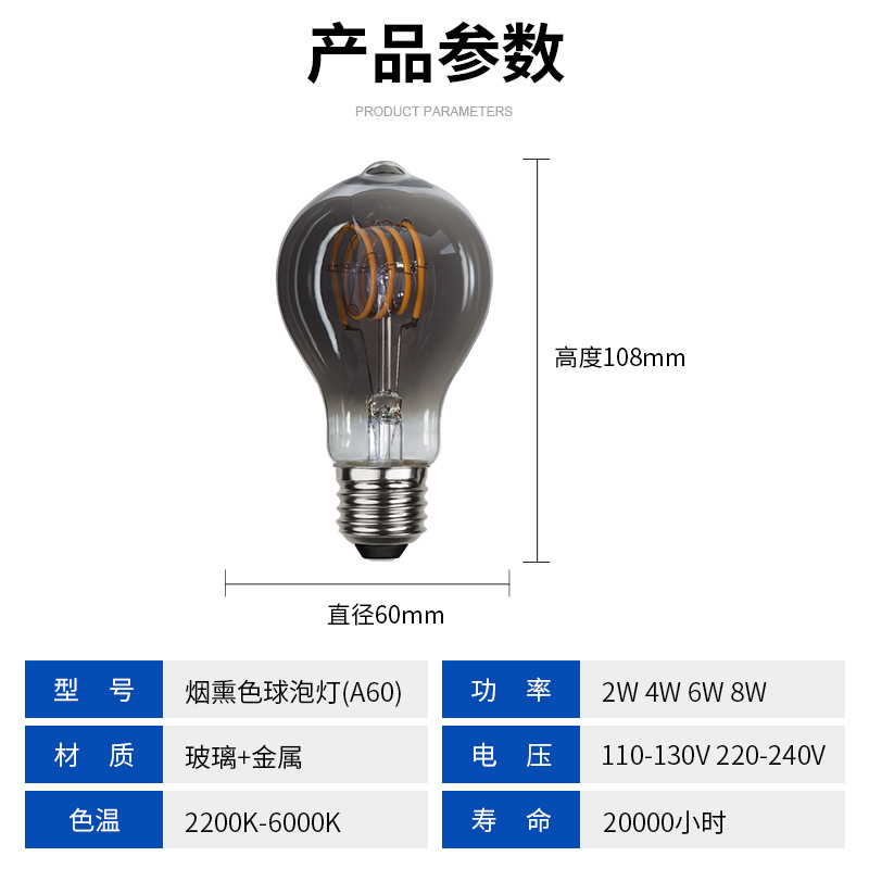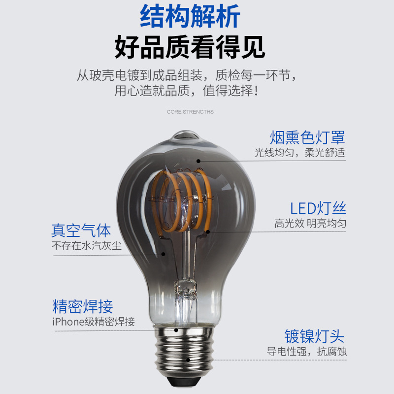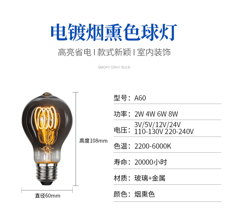 烟熏色A60爱迪生灯泡 复古e27螺口装饰灯亚马逊跨境led