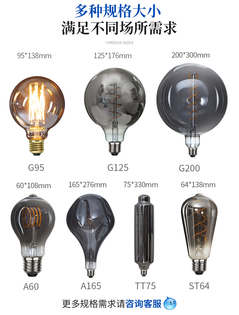 本工厂专业生产LED真空电镀灯泡、LED装饰灯丝灯、爱迪生复古、异形灯泡,可开模定制异形玻璃,卡通图案Logo 灯片。掌握了真空镀膜、封装、驱动、结构、整灯等各环节核心技术。 擅长表面颜色处理,真空电镀,喷漆等多种外观的的灯泡如茶色、烟灰色、内磨砂白,内涂白,艺术彩绘,半镀铜,镀金、银以及渐变色等。 本公司拥有进出口经营权,可供出口OEM/ODM,来图打样以及颜色处理、灯泡灯印、灯头绞字和激光打标等。