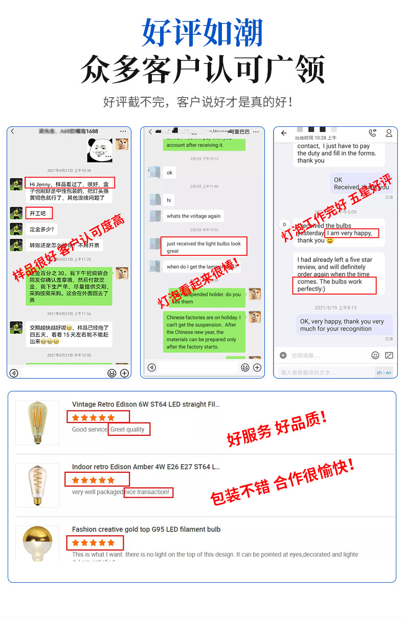 本工厂专业生产LED真空电镀灯泡、LED装饰灯丝灯、爱迪生复古、异形灯泡,可开模定制异形玻璃,卡通图案Logo 灯片。掌握了真空镀膜、封装、驱动、结构、整灯等各环节核心技术。 擅长表面颜色处理,真空电镀,喷漆等多种外观的的灯泡如茶色、烟灰色、内磨砂白,内涂白,艺术彩绘,半镀铜,镀金、银以及渐变色等。 本公司拥有进出口经营权,可供出口OEM/ODM,来图打样以及颜色处理、灯泡灯印、灯头绞字和激光打标等。