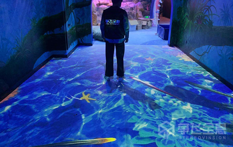 地面互动投影是采用悬挂在顶部的投影设备把影像效果投射到地面,当人走至投影区域时,通过系统识别,他们可以直接使用双脚或动作与投影幕上的虚拟场景进行交互,各种互动效果就会随着人的脚步产生相应的变幻。