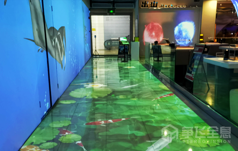 光影餐厅地面互动投影一般放置在餐厅入口处,让观众在进入餐厅的第一刻就被互动投影吸引,仿佛脚下是另一个世界,为餐厅带来人气