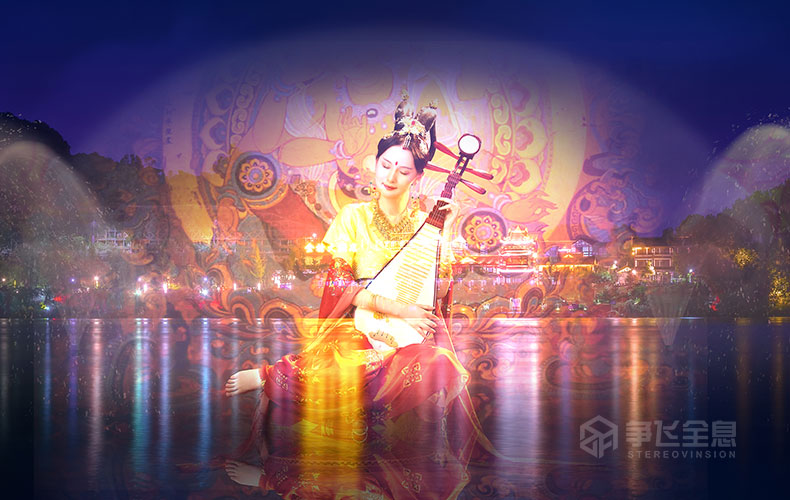 水幕电影全称激光水幕电影,是通过高压水泵和特制水幕发生器,将水自下而上,高速喷出,雾化后形成扇形“银幕”,由专用放映机将特制的录影带投射在“银幕”上,形成水幕电影。当观众在观摩电影时,扇形水幕与自然夜空融为一体,当人物出入画面时,好似人物腾起飞向天空或自天而降,产生一种虚无缥缈和梦幻的感觉,令人神往。