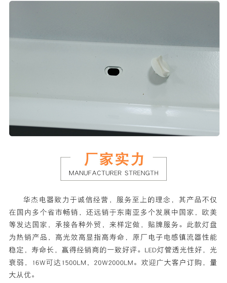 苏州市华杰五金照明电器厂位于“苏杭天堂”腹地——太湖之滨,毗邻沪、苏、杭三市,318国道和苏、浙、沪高速公路穿境而过,地理位置优越,交通十分便利,是一家专业致力研究开发照明灯具的大型高科技企业。本厂主要生产高品质“华杰”高效节能格栅灯盘,各式荧光灯支架,电感、电子镇流器及各种照明电器系列。 企业依靠先进的技术和设备,产品由配件到成品进行一体化生产经营,经过多年苦心经营,已形成了可满足市场和顾客各种需求的多样化产品系列,包括高校节能格栅灯、节能灯、各式荧光灯支架、电子、电感整流器等各类产品。此外,本厂产品还全面实施ISO9001质量保证体系,产品分别通过国家质量认证及“长城”认证,并由天安保险承保。 展望广阔前景,“华杰”为您照明,企业本着“以我们最大的努力满足客户的要求”为宗旨,致真、致城欢迎国内外客商携手合作,共创明日辉煌!