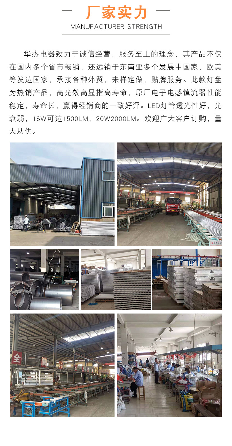 苏州市华杰五金照明电器厂位于“苏杭天堂”腹地——太湖之滨,毗邻沪、苏、杭三市,318国道和苏、浙、沪高速公路穿境而过,地理位置优越,交通十分便利,是一家专业致力研究开发照明灯具的大型高科技企业。本厂主要生产高品质“华杰”高效节能格栅灯盘,各式荧光灯支架,电感、电子镇流器及各种照明电器系列。 企业依靠先进的技术和设备,产品由配件到成品进行一体化生产经营,经过多年苦心经营,已形成了可满足市场和顾客各种需求的多样化产品系列,包括高校节能格栅灯、节能灯、各式荧光灯支架、电子、电感整流器等各类产品。此外,本厂产品还全面实施ISO9001质量保证体系,产品分别通过国家质量认证及“长城”认证,并由天安保险承保。 展望广阔前景,“华杰”为您照明,企业本着“以我们最大的努力满足客户的要求”为宗旨,致真、致城欢迎国内外客商携手合作,共创明日辉煌!