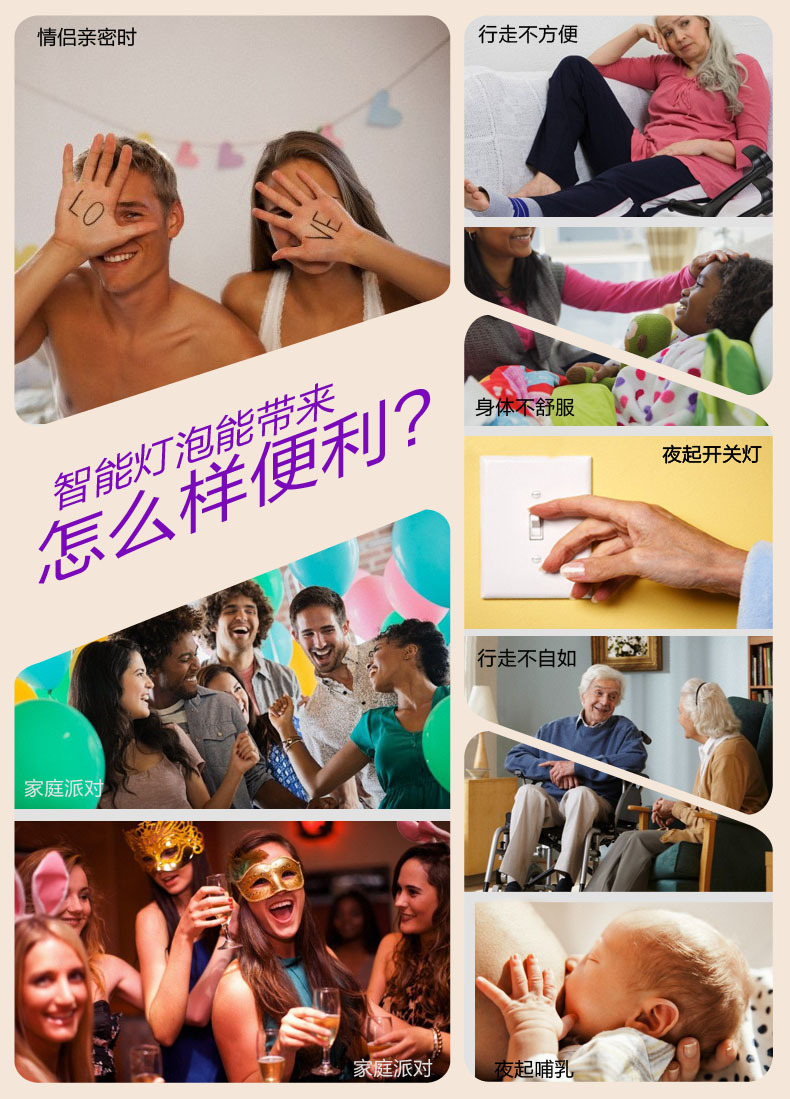 本产品是一款高性能替换传统灯泡的RGB+W LED 球泡灯,使用配套遥控器实现无线遥控和手机wifi远程遥控,拥有64 万种颜色和9 种自动演示模式的选择,更有照明用白光功能,且具有记忆功能。(即关机或断电后重新开启时,灯具会自动保留关机前 的灯光状态)。无需额外的布线安装,简单方便。采用进口LED 光源,其耗电量是传统白炽灯的20%,其使用寿命是节能灯的10 倍以上,安装,使用方便,安全稳定。