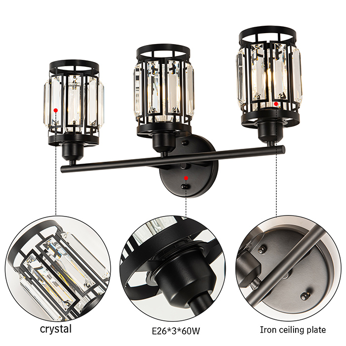 2. 灯泡要求:水晶款镜前灯3灯需要3个E26灯泡(不包括在内),最大60W。可与白炽灯、LED、CFL灯泡兼容。当与可调光开关和灯泡(不包括在内)一起使用时,现代黑色化妆灯可调光。