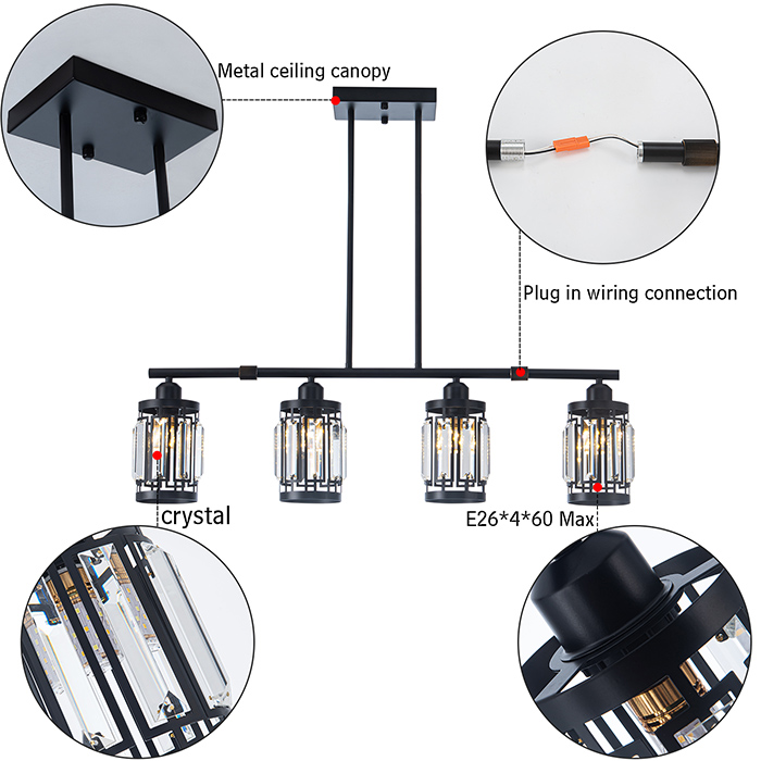 【尺寸和安装】吸顶盒:宽度5英寸*长度9英寸;灯罩尺寸:5.5英寸(D)x 7英寸(H),总高度可通过更换吊线进行调整。我们的4灯餐厅灯具配备了所有安装配件,使其安装非常快速和方便。