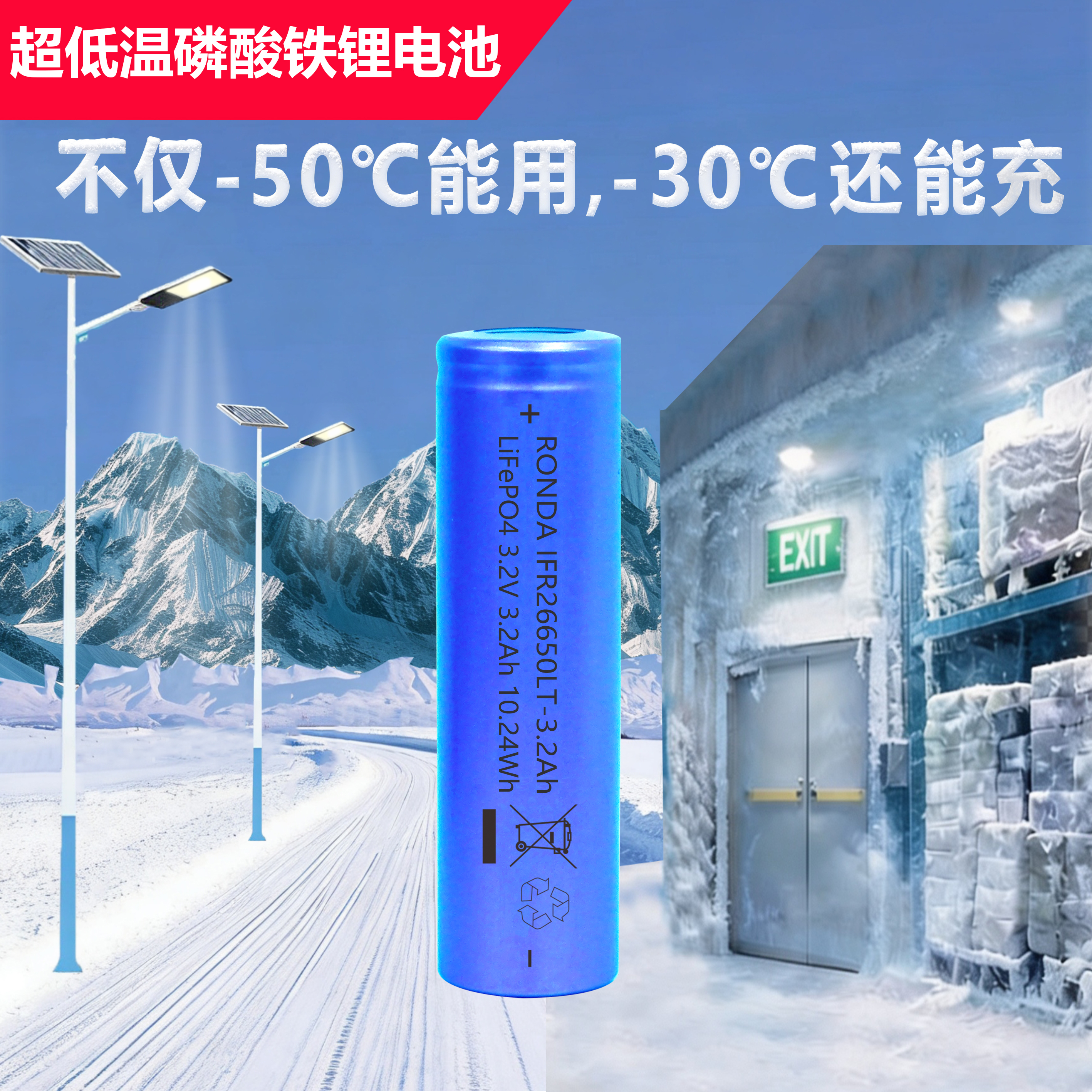 本款 RONDA IFR26650LT-3.2Ah 超低温磷酸铁锂(LiFePO4)圆柱电芯,是专为极端严寒环境打造的高容量特种储能单元。采用磷酸铁锂化学体系,标称电压 3.2V,额定容量 3.2Ah,额定能量 10.24Wh,标准 26650 圆柱规格(直径 26mm× 长度 65mm),可在 **-50℃超低温环境下稳定工作 **,完美解决普通 26650 锂电池低温失效、容量骤降的痛点,是寒区储能、太阳能照明、冷库设备等场景的高可靠供电选择。