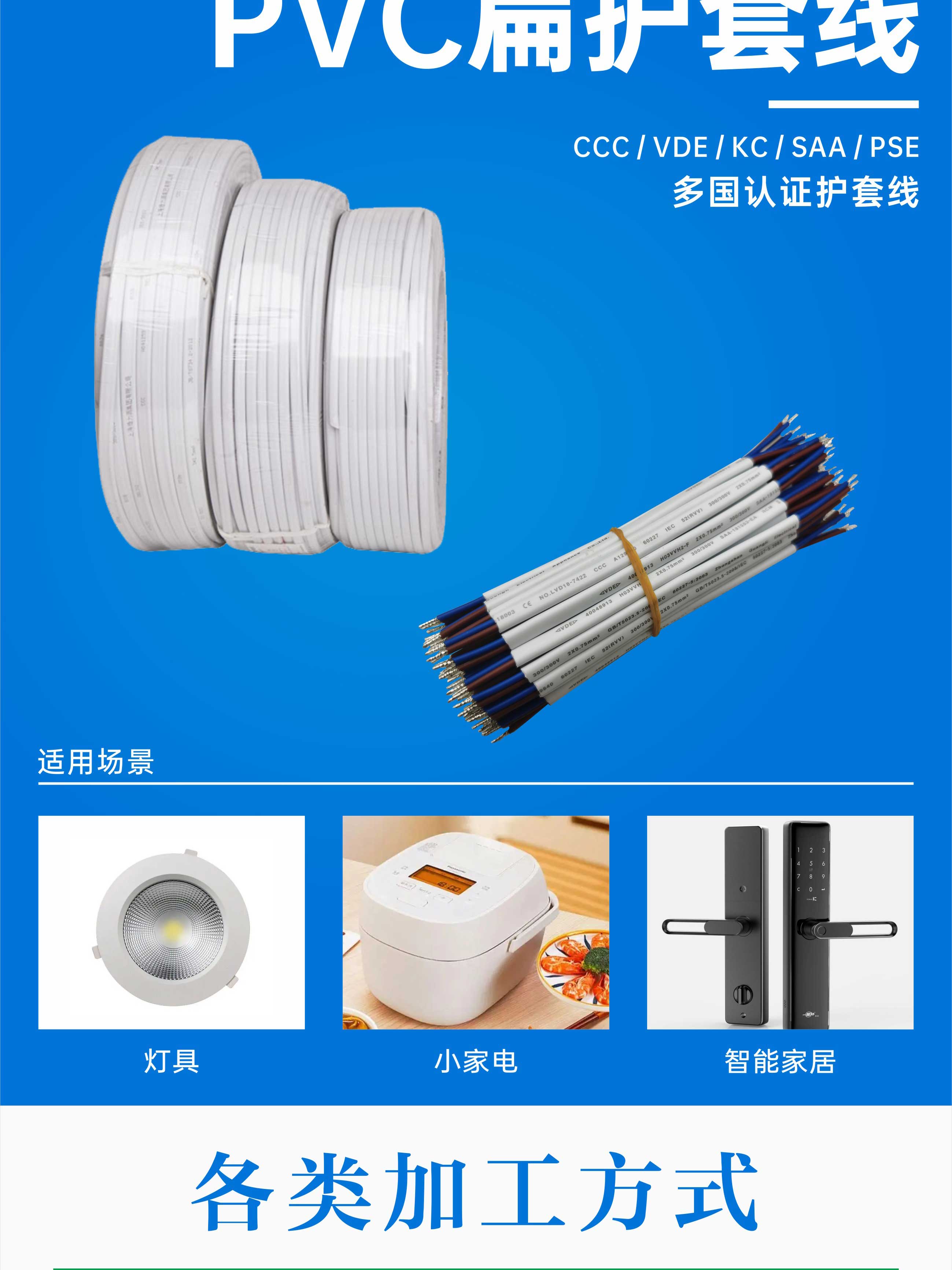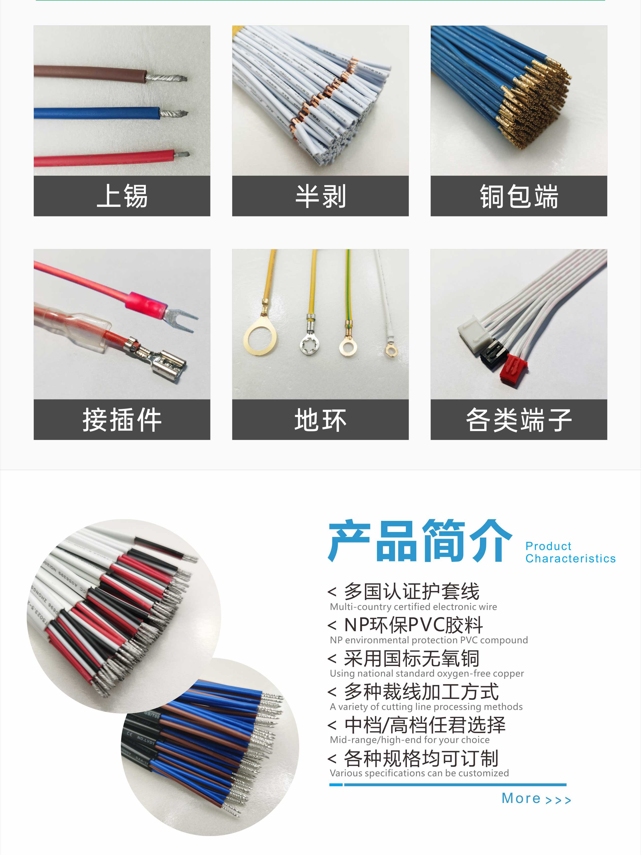 公司骨干力量从2007年起开始从事电子线加工生产,发展至今,已累积了丰富的生产及加工经验,目前本厂拥有拉线机、注塑机、全自动端子机、大型裁线机和电脑裁线机、扎线机等各类生产加工机器近百台,主要生产和加工电子线、护套线、橡胶线、高温线、AC插头线、DC插头线、防水插头线、线束、贴片端子等电器用线。线材可提供CCC、VDE、KC、SAA、PSE和UL认证。本厂始终贯彻用良“芯”,做好线的原则,遵循“质量、速度、服务”的经营理念,坚守底线,诚信待人现已累积了以珠三角为主,覆盖全国及其他部分国家的大量长期稳定客户,是诸多电源控制器、照明及电器企业值得信赖的优质配件供应商。为适应市场,满足广大客商的需求,还可代客开模,共同开发各类新的线材类产品,并协助客户制定产品布线方案,欢迎各大商家垂询、治谈,亦可前来门市及工厂实地考察指导。