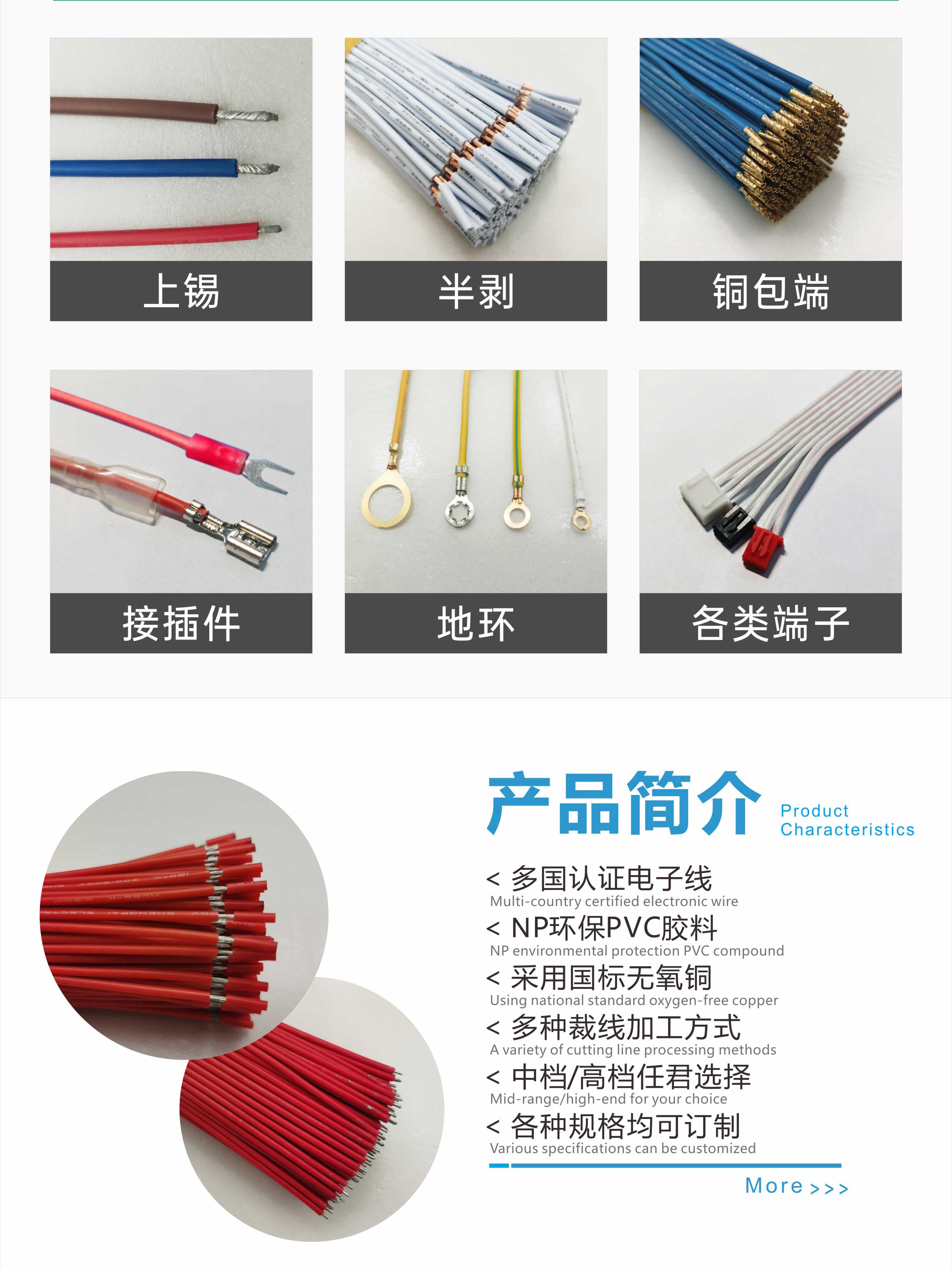 公司骨干力量从2007年起开始从事电子线加工生产,发展至今,已累积了丰富的生产及加工经验,目前本厂拥有拉线机、注塑机、全自动端子机、大型裁线机和电脑裁线机、扎线机等各类生产加工机器近百台,主要生产和加工电子线、护套线、橡胶线、高温线、AC插头线、DC插头线、防水插头线、线束、贴片端子等电器用线。线材可提供CCC、VDE、KC、SAA、PSE和UL认证。本厂始终贯彻用良“芯”,做好线的原则,遵循“质量、速度、服务”的经营理念,坚守底线,诚信待人现已累积了以珠三角为主,覆盖全国及其他部分国家的大量长期稳定客户,是诸多电源控制器、照明及电器企业值得信赖的优质配件供应商。为适应市场,满足广大客商的需求,还可代客开模,共同开发各类新的线材类产品,并协助客户制定产品布线方案,欢迎各大商家垂询、治谈,亦可前来门市及工厂实地考察指导。