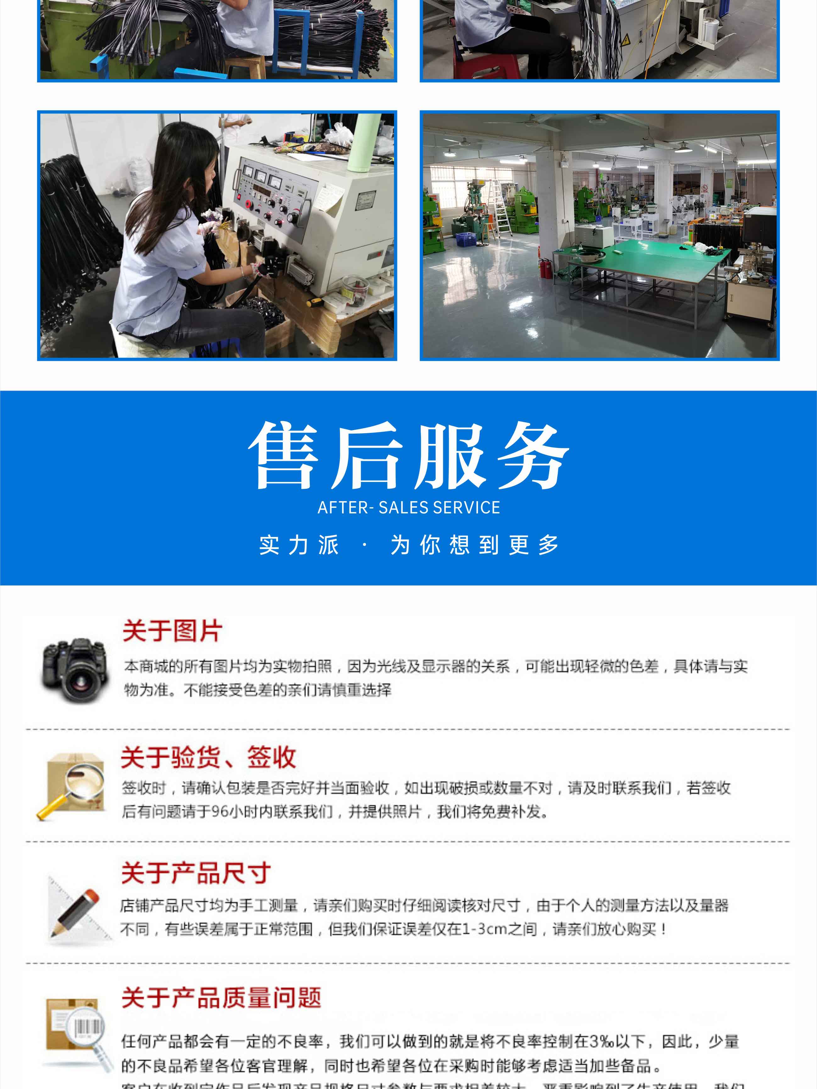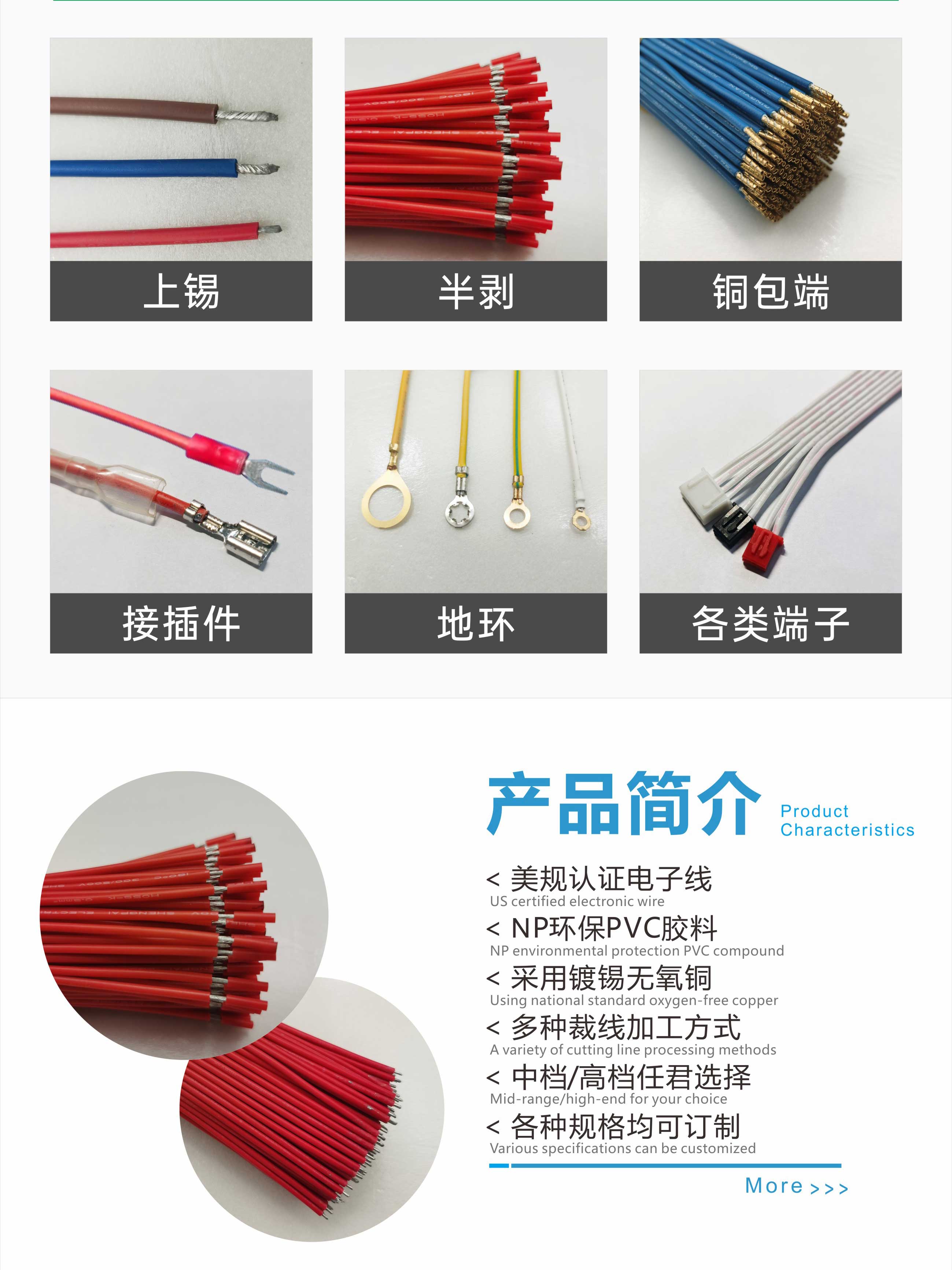 公司骨干力量从2007年起开始从事电子线加工生产,发展至今,已累积了丰富的生产及加工经验,目前本厂拥有拉线机、注塑机、全自动端子机、大型裁线机和电脑裁线机、扎线机等各类生产加工机器近百台,主要生产和加工电子线、护套线、橡胶线、高温线、AC插头线、DC插头线、防水插头线、线束、贴片端子等电器用线。线材可提供CCC、VDE、KC、SAA、PSE和UL认证。本厂始终贯彻用良“芯”,做好线的原则,遵循“质量、速度、服务”的经营理念,坚守底线,诚信待人现已累积了以珠三角为主,覆盖全国及其他部分国家的大量长期稳定客户,是诸多电源控制器、照明及电器企业值得信赖的优质配件供应商。为适应市场,满足广大客商的需求,还可代客开模,共同开发各类新的线材类产品,并协助客户制定产品布线方案,欢迎各大商家垂询、治谈,亦可前来门市及工厂实地考察指导。