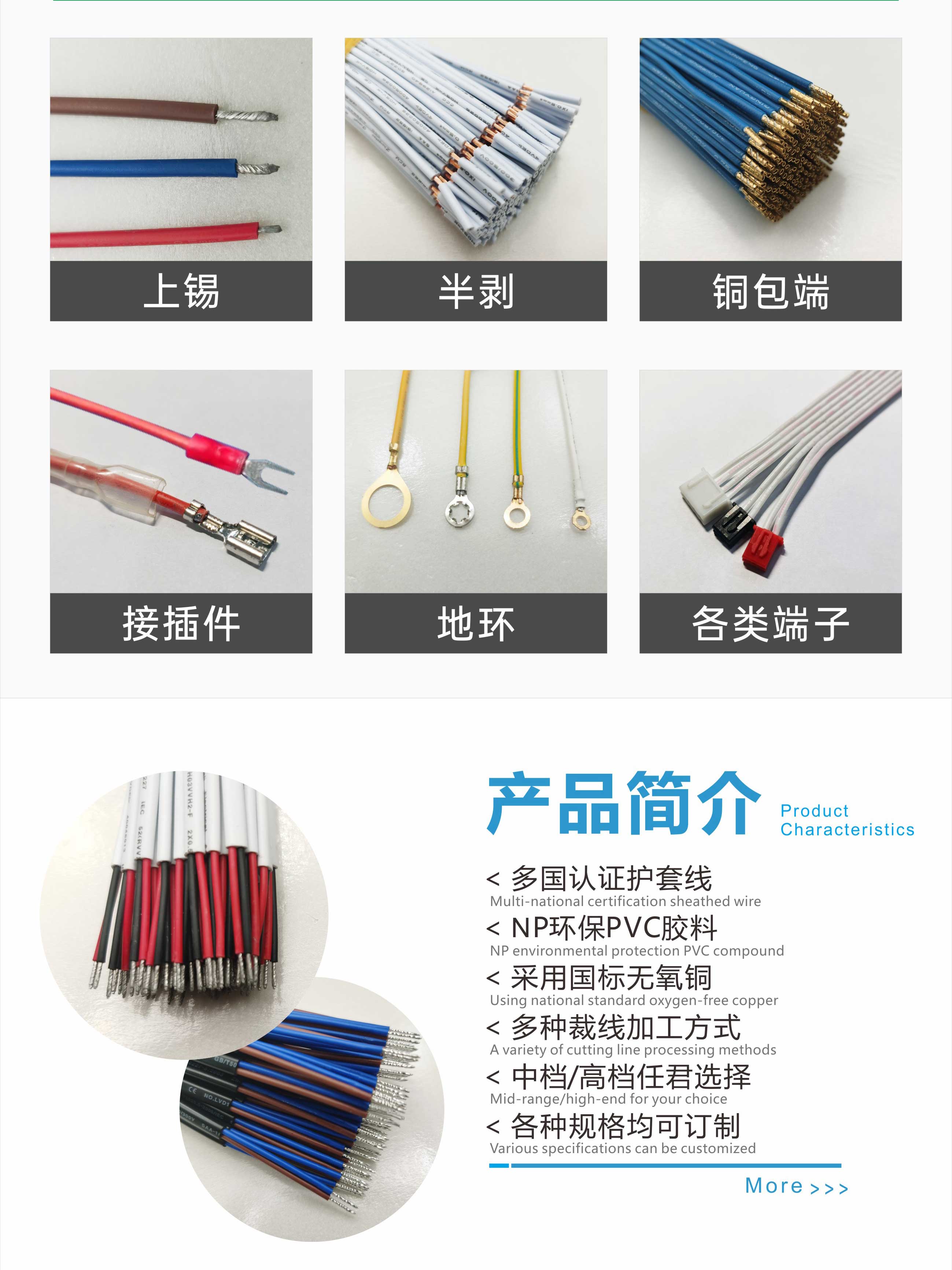 公司骨干力量从2007年起开始从事电子线加工生产,发展至今,已累积了丰富的生产及加工经验,目前本厂拥有拉线机、注塑机、全自动端子机、大型裁线机和电脑裁线机、扎线机等各类生产加工机器近百台,主要生产和加工电子线、护套线、橡胶线、高温线、AC插头线、DC插头线、防水插头线、线束、贴片端子等电器用线。线材可提供CCC、VDE、KC、SAA、PSE和UL认证。本厂始终贯彻用良“芯”,做好线的原则,遵循“质量、速度、服务”的经营理念,坚守底线,诚信待人现已累积了以珠三角为主,覆盖全国及其他部分国家的大量长期稳定客户,是诸多电源控制器、照明及电器企业值得信赖的优质配件供应商。为适应市场,满足广大客商的需求,还可代客开模,共同开发各类新的线材类产品,并协助客户制定产品布线方案,欢迎各大商家垂询、治谈,亦可前来门市及工厂实地考察指导。