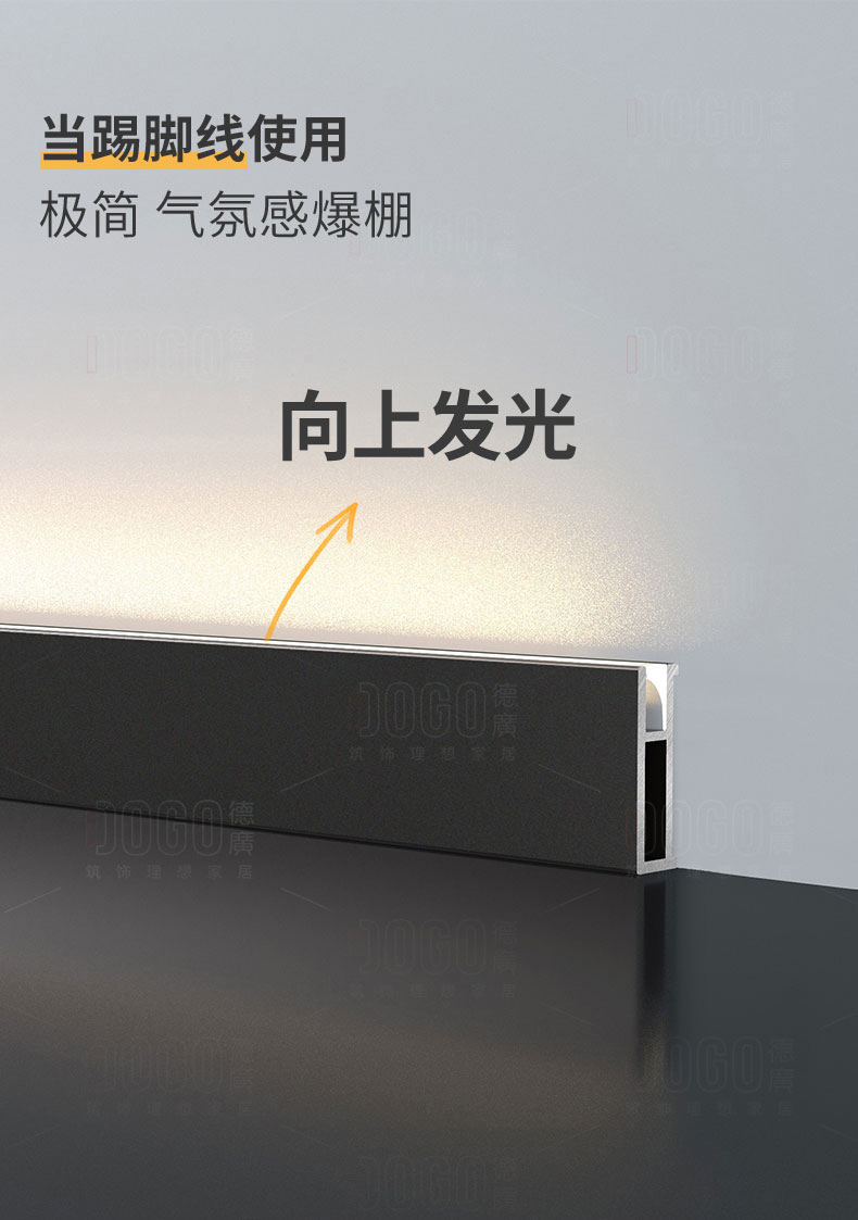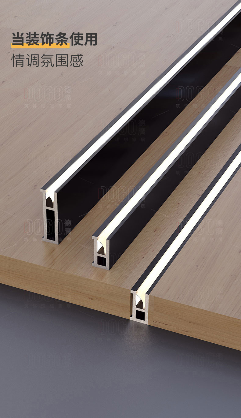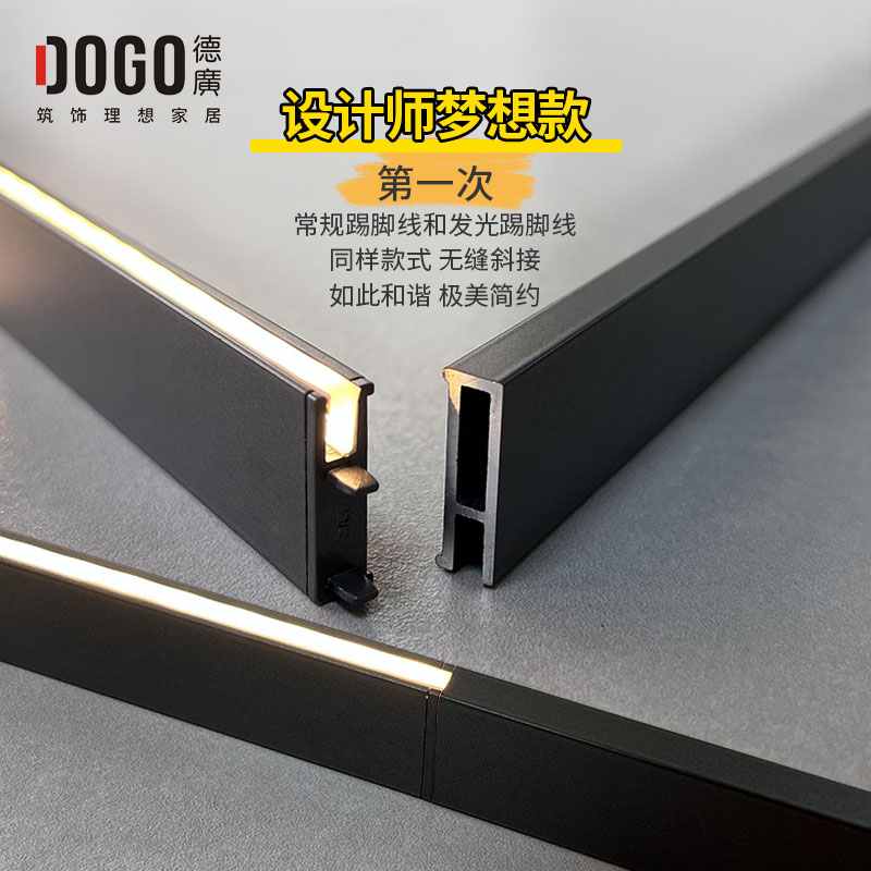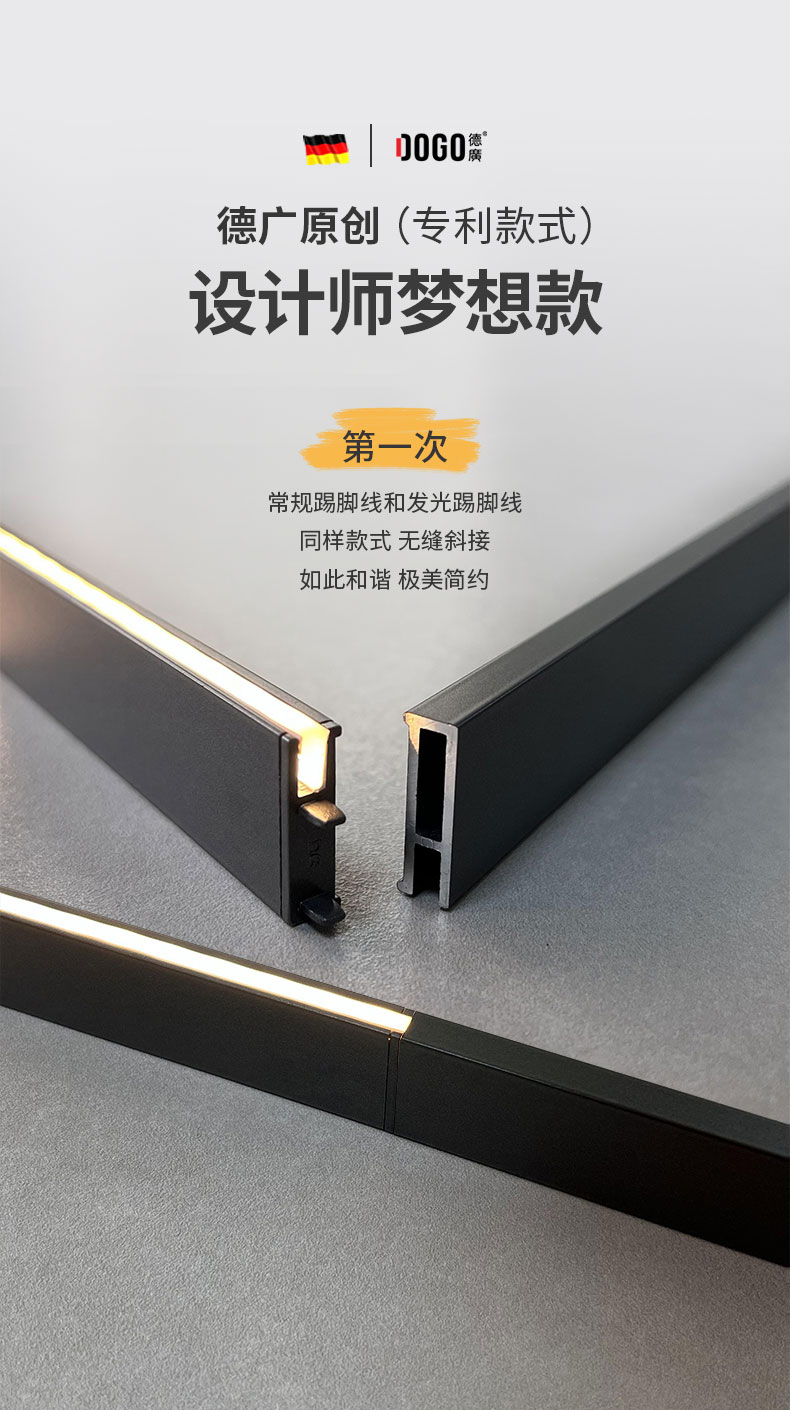 德广——全品类发光踢脚线领创者德广铝业坐落于中国铝材之都·佛山,专注于铝合金全品类踢脚线及装饰发光线条领域。我们以“光与金属的融合”为设计原点,率先构建起行业内品类齐全的发光踢脚线矩阵——向上发光、正面发光、向下发光、明装发光、内嵌发光……全场景覆盖,满足不同空间与安装需求。不止于踢脚线,我们将光的艺术延伸至天花,推出发光天花线系列,让光从脚下蔓延至头顶,打造一体化光影空间。大部分款式采用硅胶灯罩透光设计,光线柔和不刺眼,见光不见灯,兼顾视觉舒适与安装安全。我们始终保持高频率的产品迭代,持续推出具有创新力的发光产品,不断拓宽铝合金线条的边界。德广以佛山制造的精工底蕴,为设计师、工程方及家居用户提供“够全、够新、够柔光”的发光线条解决方案。德广铝合金线条 · 让光有型,让家有温