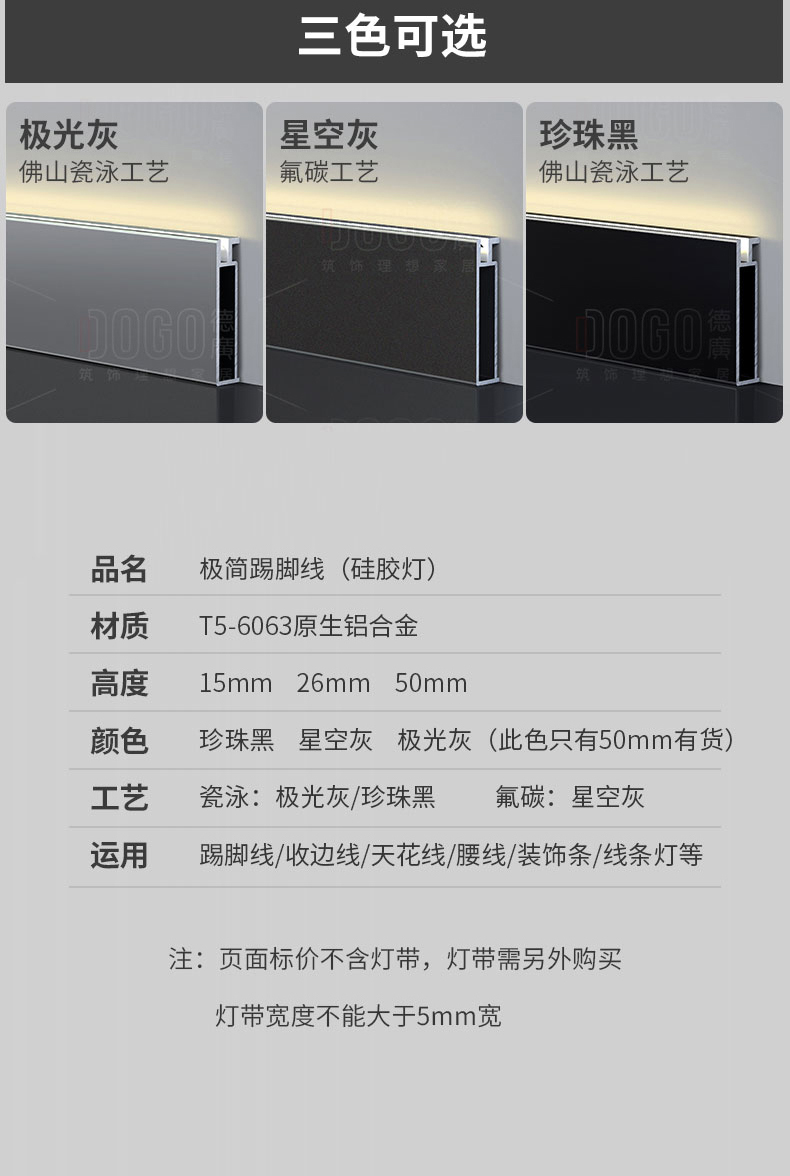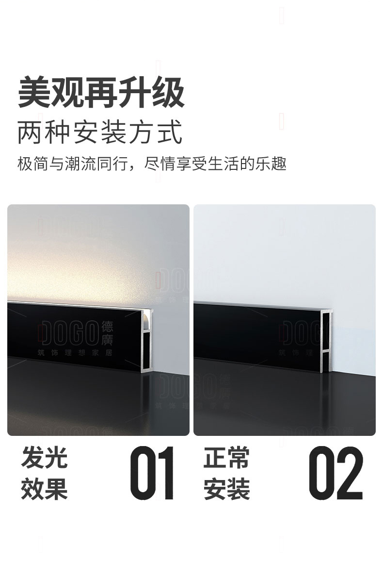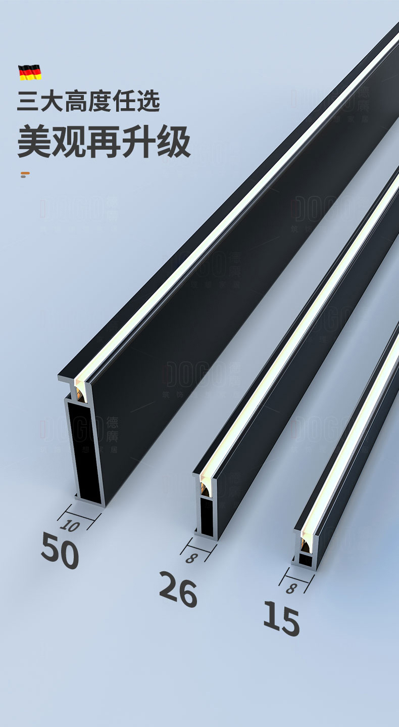德广——全品类发光踢脚线领创者德广铝业坐落于中国铝材之都·佛山,专注于铝合金全品类踢脚线及装饰发光线条领域。我们以“光与金属的融合”为设计原点,率先构建起行业内品类齐全的发光踢脚线矩阵——向上发光、正面发光、向下发光、明装发光、内嵌发光……全场景覆盖,满足不同空间与安装需求。不止于踢脚线,我们将光的艺术延伸至天花,推出发光天花线系列,让光从脚下蔓延至头顶,打造一体化光影空间。大部分款式采用硅胶灯罩透光设计,光线柔和不刺眼,见光不见灯,兼顾视觉舒适与安装安全。我们始终保持高频率的产品迭代,持续推出具有创新力的发光产品,不断拓宽铝合金线条的边界。德广以佛山制造的精工底蕴,为设计师、工程方及家居用户提供“够全、够新、够柔光”的发光线条解决方案。德广铝合金线条 · 让光有型,让家有温