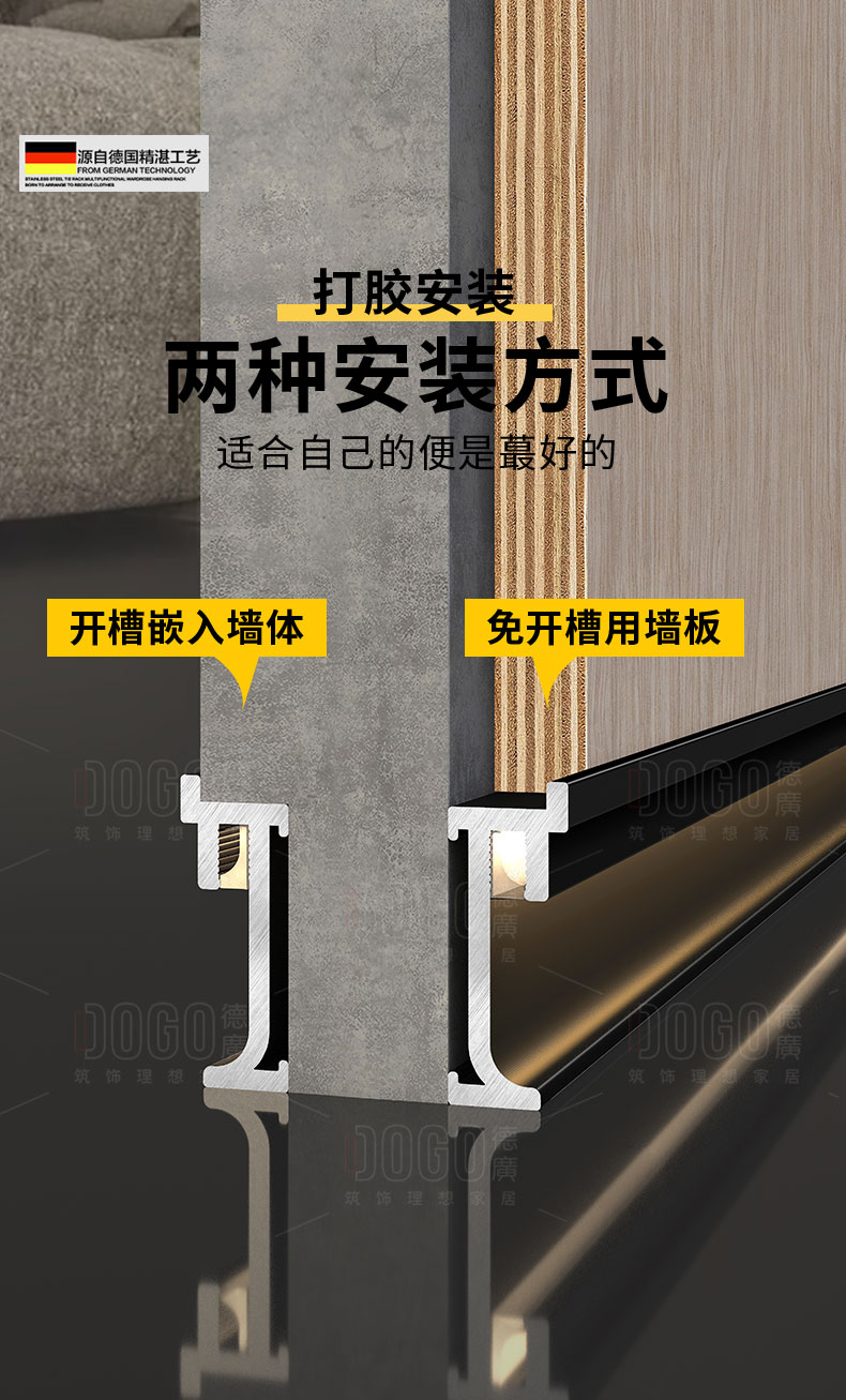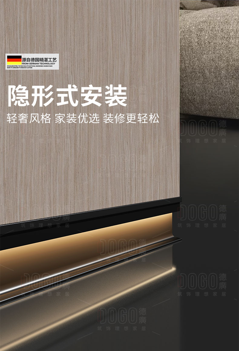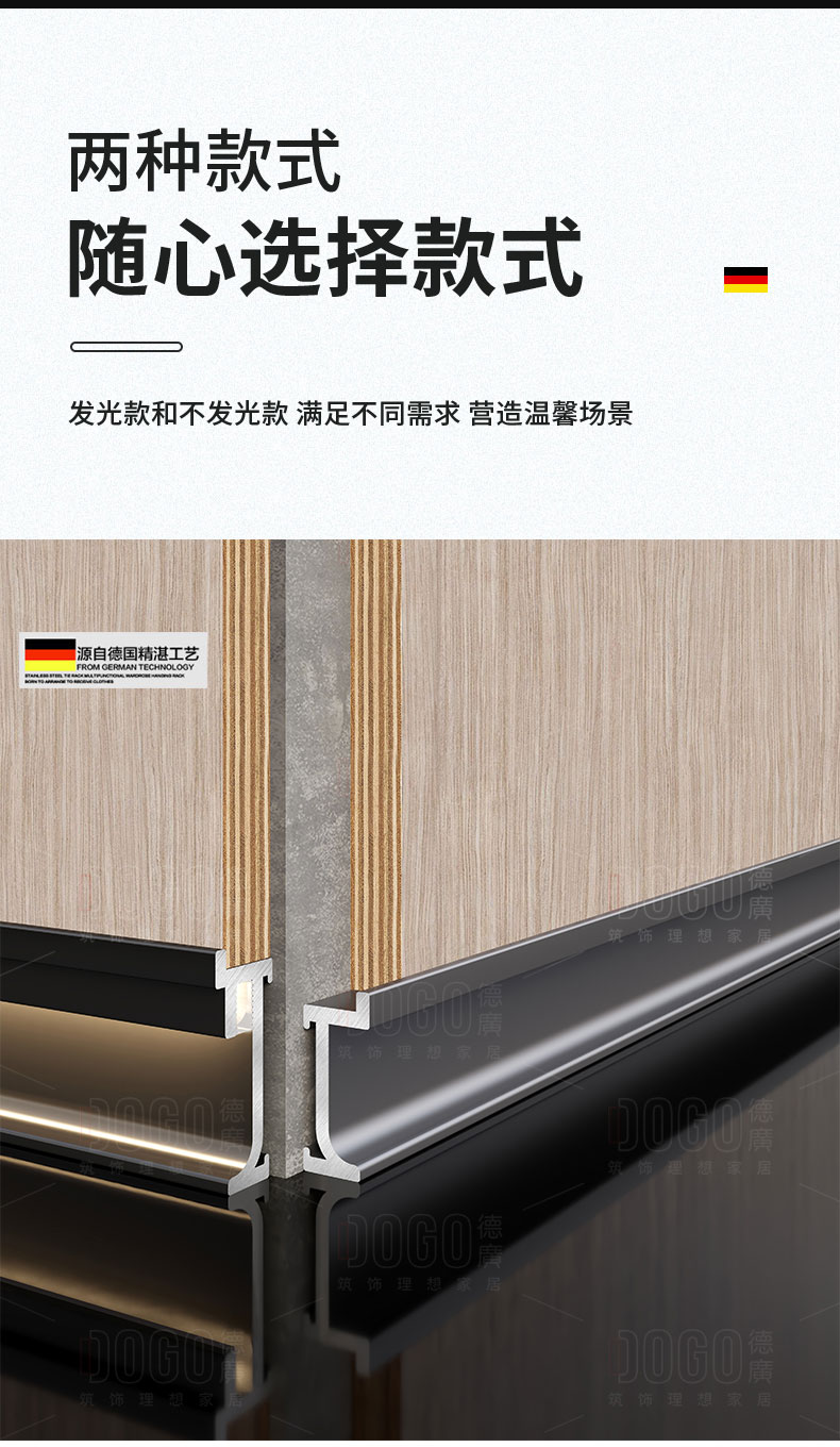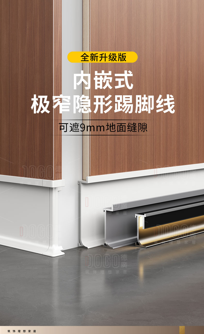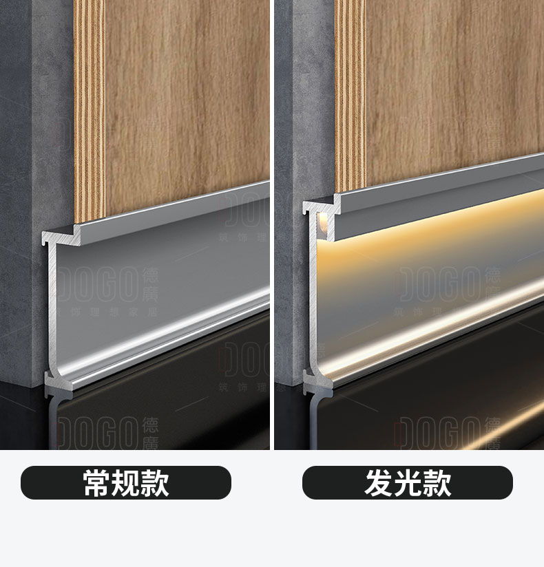 德广——全品类发光踢脚线领创者德广铝业坐落于中国铝材之都·佛山,专注于铝合金全品类踢脚线及装饰发光线条领域。我们以“光与金属的融合”为设计原点,率先构建起行业内品类齐全的发光踢脚线矩阵——向上发光、正面发光、向下发光、明装发光、内嵌发光……全场景覆盖,满足不同空间与安装需求。不止于踢脚线,我们将光的艺术延伸至天花,推出发光天花线系列,让光从脚下蔓延至头顶,打造一体化光影空间。大部分款式采用硅胶灯罩透光设计,光线柔和不刺眼,见光不见灯,兼顾视觉舒适与安装安全。我们始终保持高频率的产品迭代,持续推出具有创新力的发光产品,不断拓宽铝合金线条的边界。德广以佛山制造的精工底蕴,为设计师、工程方及家居用户提供“够全、够新、够柔光”的发光线条解决方案。德广铝合金线条 · 让光有型,让家有温