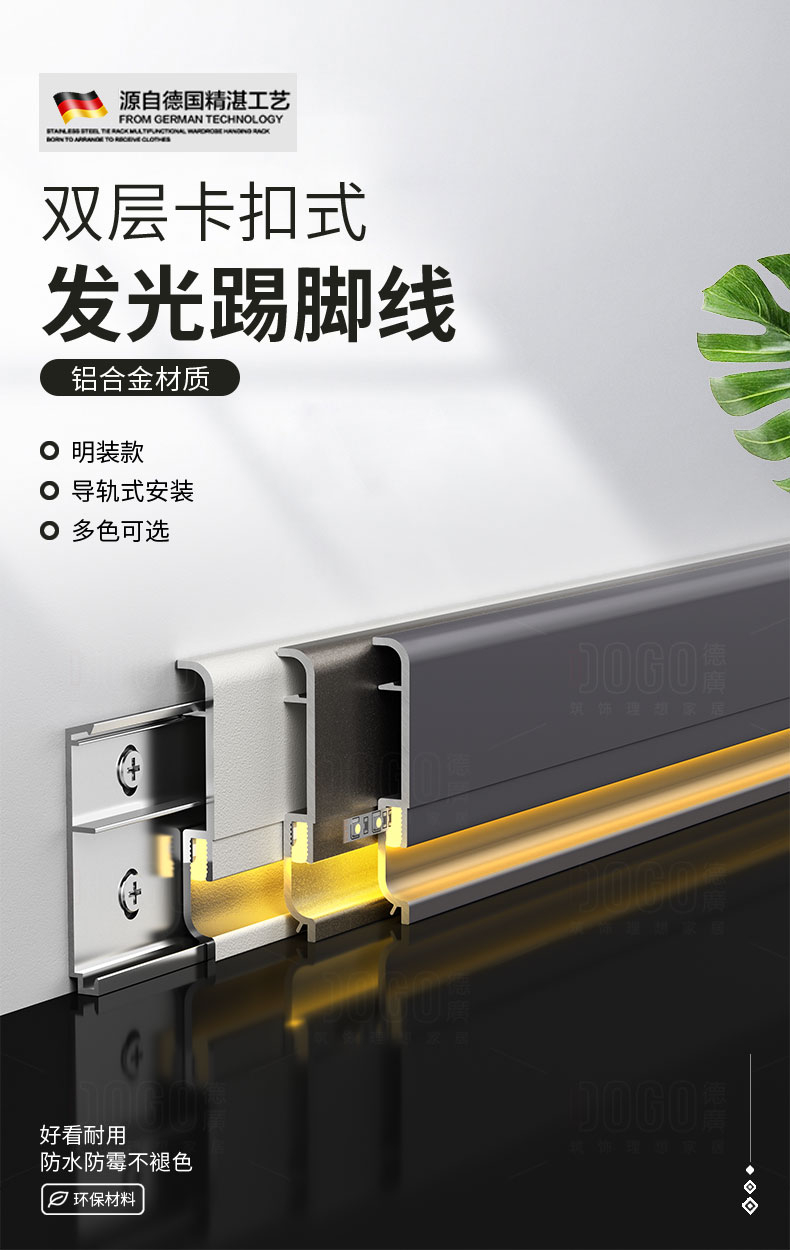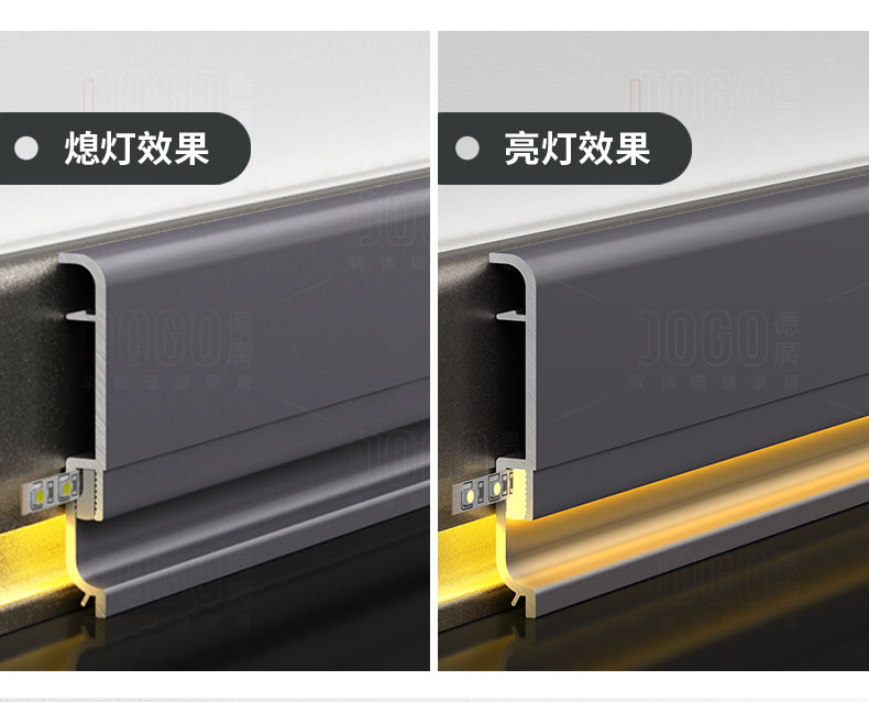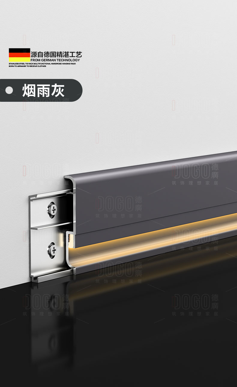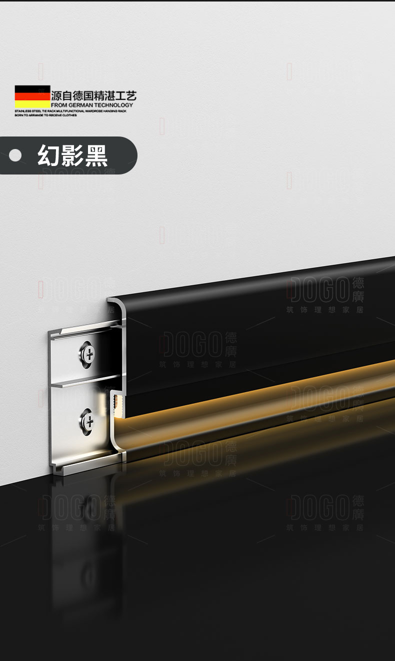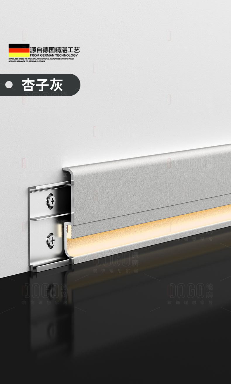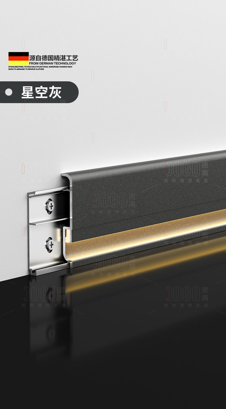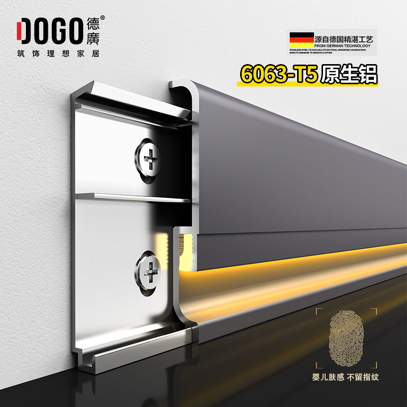德广——全品类发光踢脚线领创者德广铝业坐落于中国铝材之都·佛山,专注于铝合金全品类踢脚线及装饰发光线条领域。我们以“光与金属的融合”为设计原点,率先构建起行业内品类齐全的发光踢脚线矩阵——向上发光、正面发光、向下发光、明装发光、内嵌发光……全场景覆盖,满足不同空间与安装需求。不止于踢脚线,我们将光的艺术延伸至天花,推出发光天花线系列,让光从脚下蔓延至头顶,打造一体化光影空间。大部分款式采用硅胶灯罩透光设计,光线柔和不刺眼,见光不见灯,兼顾视觉舒适与安装安全。我们始终保持高频率的产品迭代,持续推出具有创新力的发光产品,不断拓宽铝合金线条的边界。德广以佛山制造的精工底蕴,为设计师、工程方及家居用户提供“够全、够新、够柔光”的发光线条解决方案。德广铝合金线条 · 让光有型,让家有温