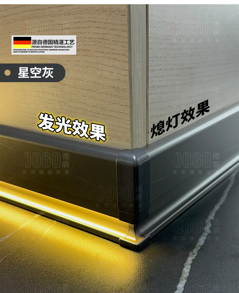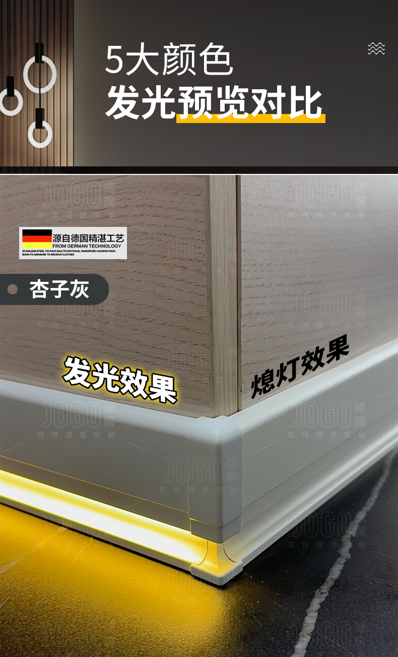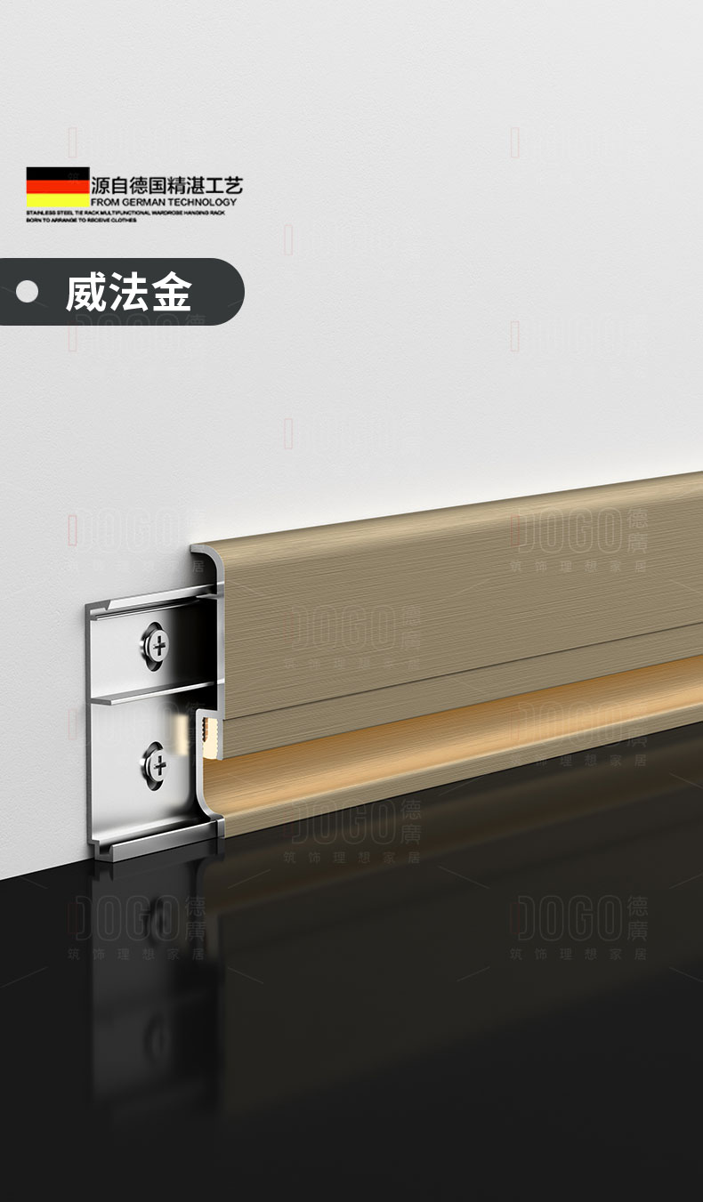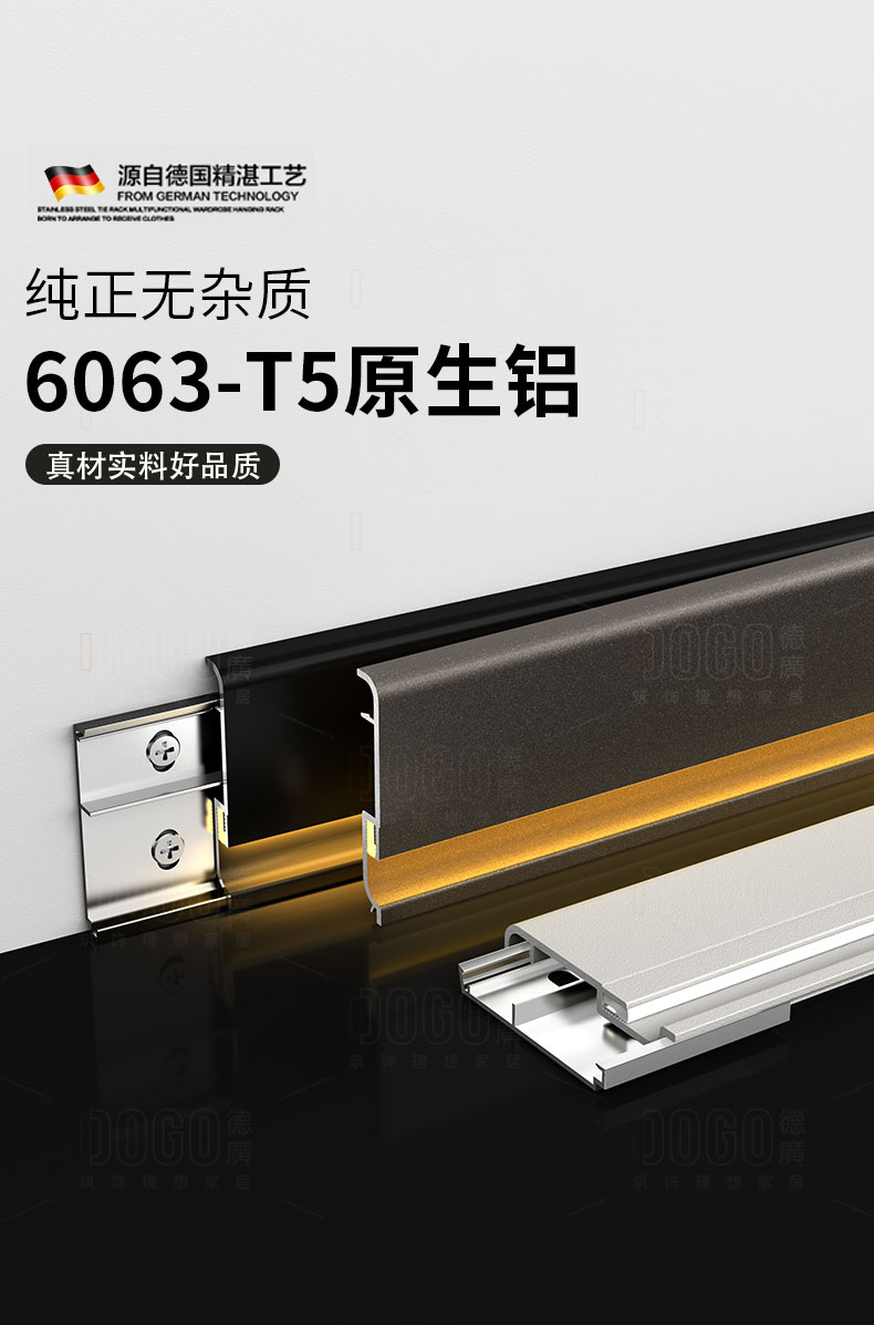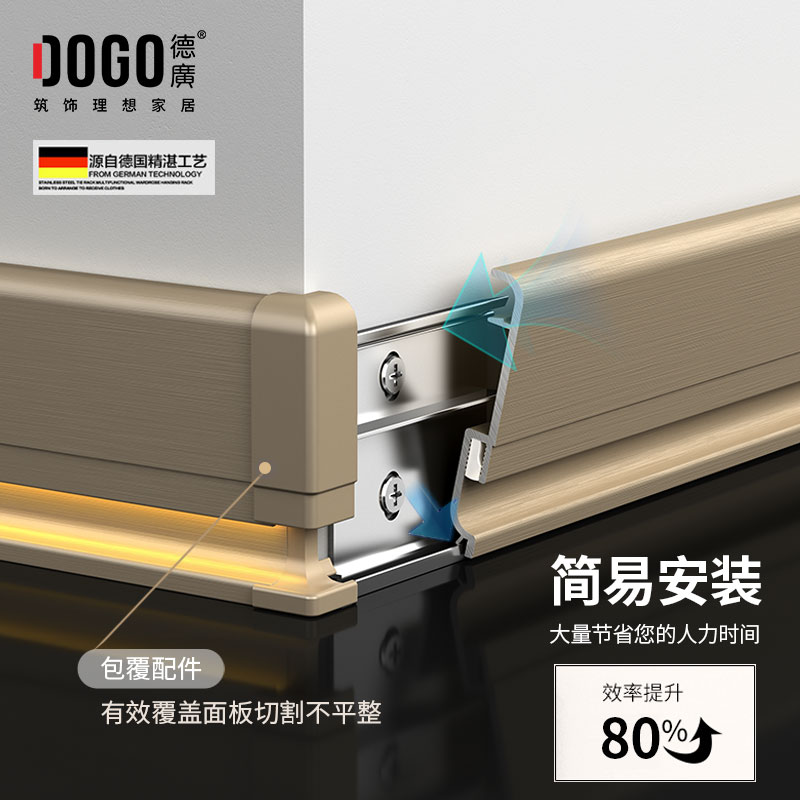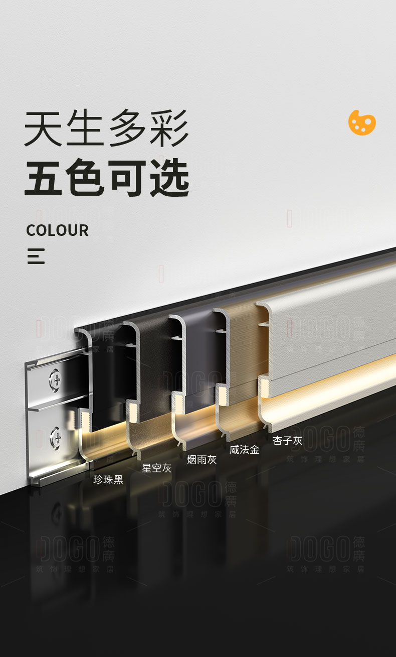 德广——全品类发光踢脚线领创者德广铝业坐落于中国铝材之都·佛山,专注于铝合金全品类踢脚线及装饰发光线条领域。我们以“光与金属的融合”为设计原点,率先构建起行业内品类齐全的发光踢脚线矩阵——向上发光、正面发光、向下发光、明装发光、内嵌发光……全场景覆盖,满足不同空间与安装需求。不止于踢脚线,我们将光的艺术延伸至天花,推出发光天花线系列,让光从脚下蔓延至头顶,打造一体化光影空间。大部分款式采用硅胶灯罩透光设计,光线柔和不刺眼,见光不见灯,兼顾视觉舒适与安装安全。我们始终保持高频率的产品迭代,持续推出具有创新力的发光产品,不断拓宽铝合金线条的边界。德广以佛山制造的精工底蕴,为设计师、工程方及家居用户提供“够全、够新、够柔光”的发光线条解决方案。德广铝合金线条 · 让光有型,让家有温