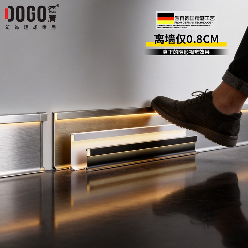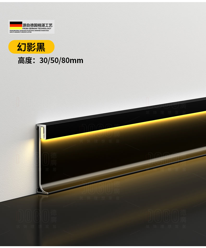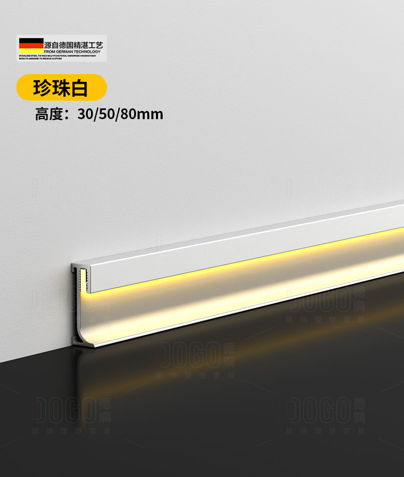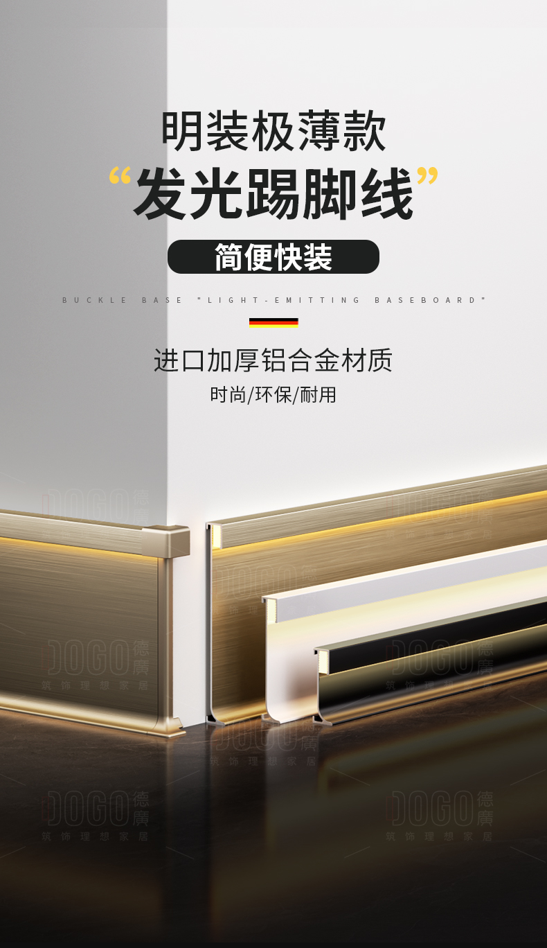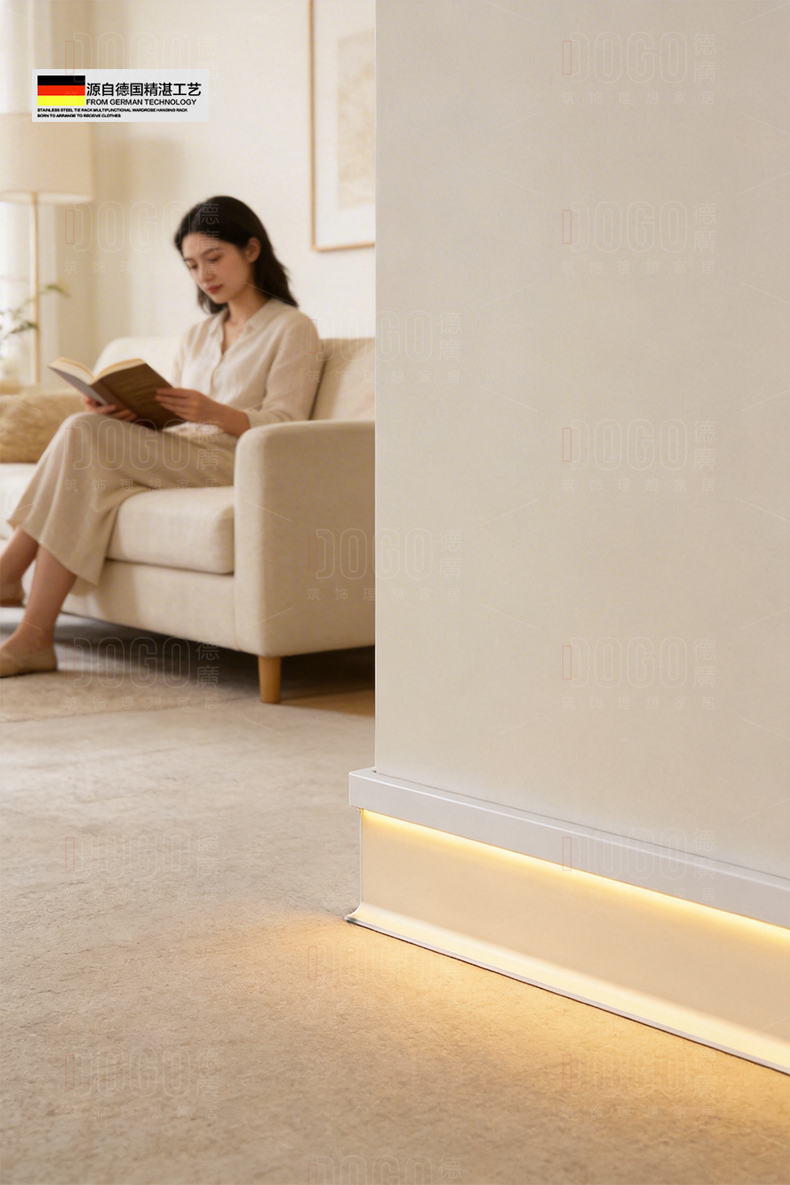 德广——全品类发光踢脚线领创者德广铝业坐落于中国铝材之都·佛山,专注于铝合金全品类踢脚线及装饰发光线条领域。我们以“光与金属的融合”为设计原点,率先构建起行业内品类齐全的发光踢脚线矩阵——向上发光、正面发光、向下发光、明装发光、内嵌发光……全场景覆盖,满足不同空间与安装需求。不止于踢脚线,我们将光的艺术延伸至天花,推出发光天花线系列,让光从脚下蔓延至头顶,打造一体化光影空间。大部分款式采用硅胶灯罩透光设计,光线柔和不刺眼,见光不见灯,兼顾视觉舒适与安装安全。我们始终保持高频率的产品迭代,持续推出具有创新力的发光产品,不断拓宽铝合金线条的边界。德广以佛山制造的精工底蕴,为设计师、工程方及家居用户提供“够全、够新、够柔光”的发光线条解决方案。德广铝合金线条 · 让光有型,让家有温