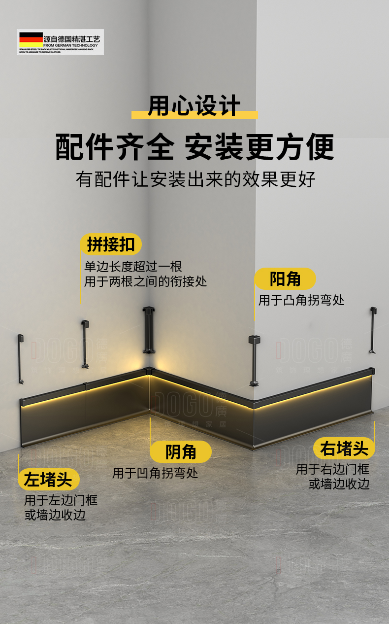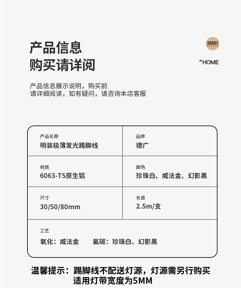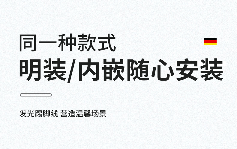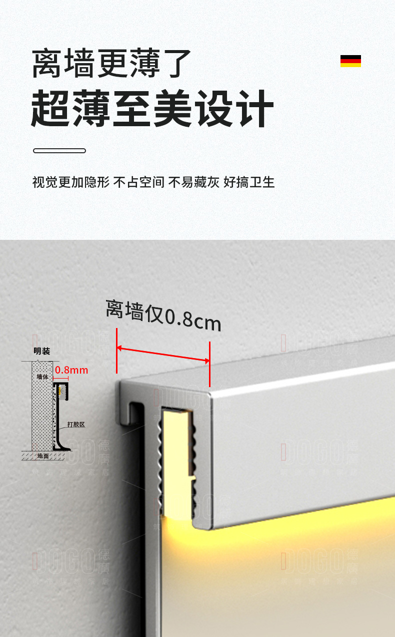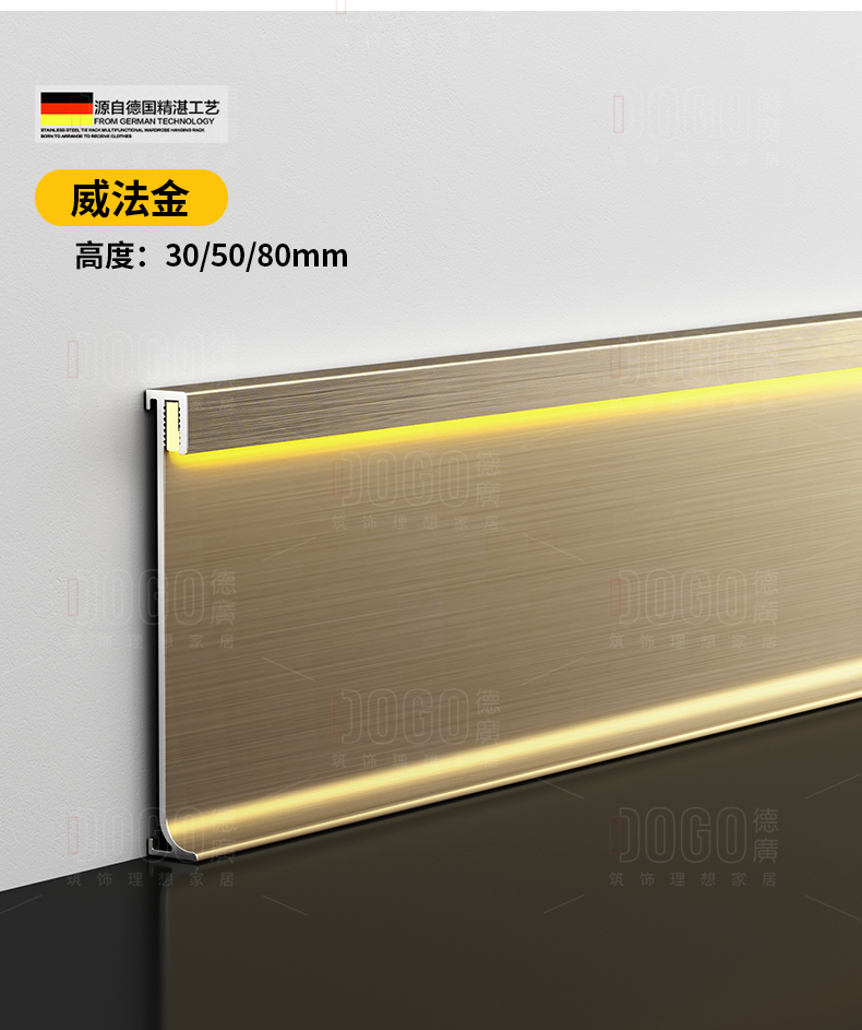 德广——全品类发光踢脚线领创者德广铝业坐落于中国铝材之都·佛山,专注于铝合金全品类踢脚线及装饰发光线条领域。我们以“光与金属的融合”为设计原点,率先构建起行业内品类齐全的发光踢脚线矩阵——向上发光、正面发光、向下发光、明装发光、内嵌发光……全场景覆盖,满足不同空间与安装需求。不止于踢脚线,我们将光的艺术延伸至天花,推出发光天花线系列,让光从脚下蔓延至头顶,打造一体化光影空间。大部分款式采用硅胶灯罩透光设计,光线柔和不刺眼,见光不见灯,兼顾视觉舒适与安装安全。我们始终保持高频率的产品迭代,持续推出具有创新力的发光产品,不断拓宽铝合金线条的边界。德广以佛山制造的精工底蕴,为设计师、工程方及家居用户提供“够全、够新、够柔光”的发光线条解决方案。德广铝合金线条 · 让光有型,让家有温