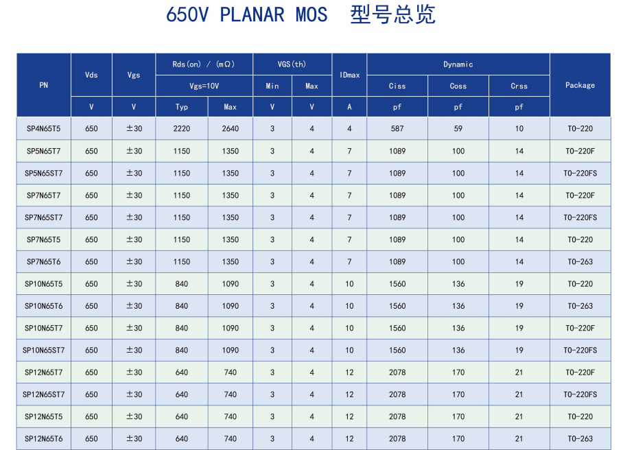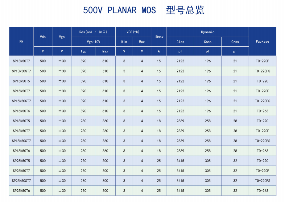 萨瑞微提供500V-800V 平面栅VDMOS 。产品采用业界优良的平面技术、独特的器件设计,并结合萨瑞自有封装优势,雪崩耐量高, EMI兼容性好, 抗冲击能力强。