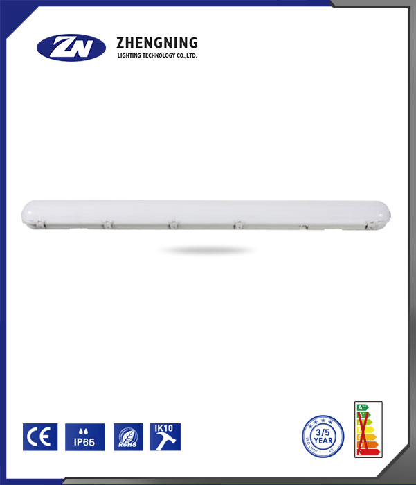 这是正宁照明科技有限公司(ZHENGNING LIGHTING TECHNOLOGY CO., LTD.)生产的灯具。 该灯具为长条状,外观简洁。从下方标识可知,它通过了CE认证;防护等级达到IP66,具备出色的防尘防水能力;抗冲击等级为IK10,能承受较强冲击;符合RoHS标准,较为环保;提供3到5年的质保期限,且从能效标识来看,能效等级表现较好。