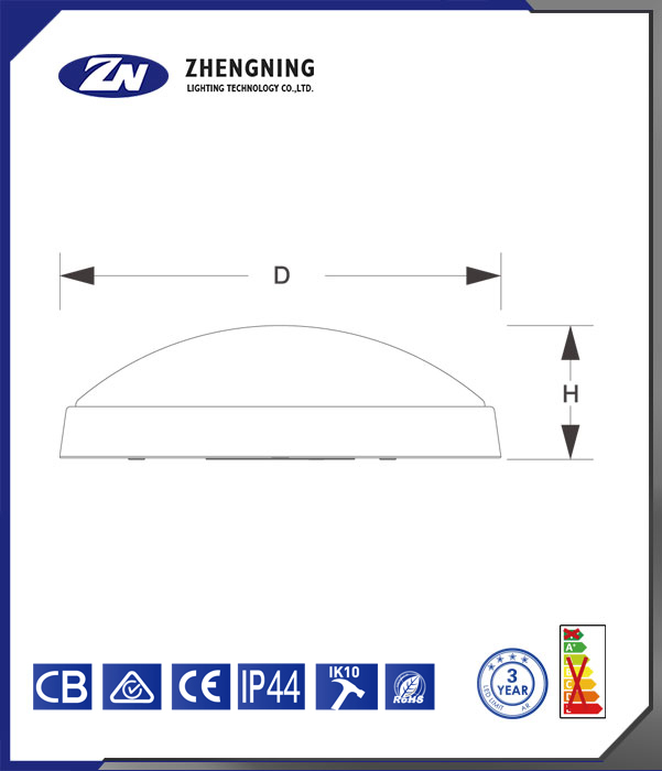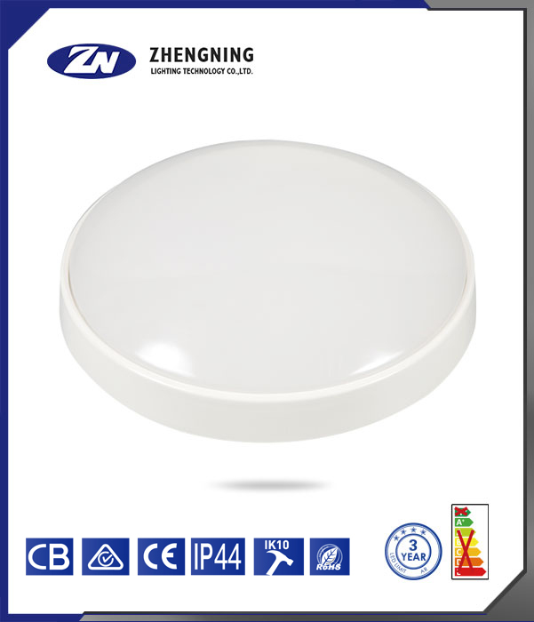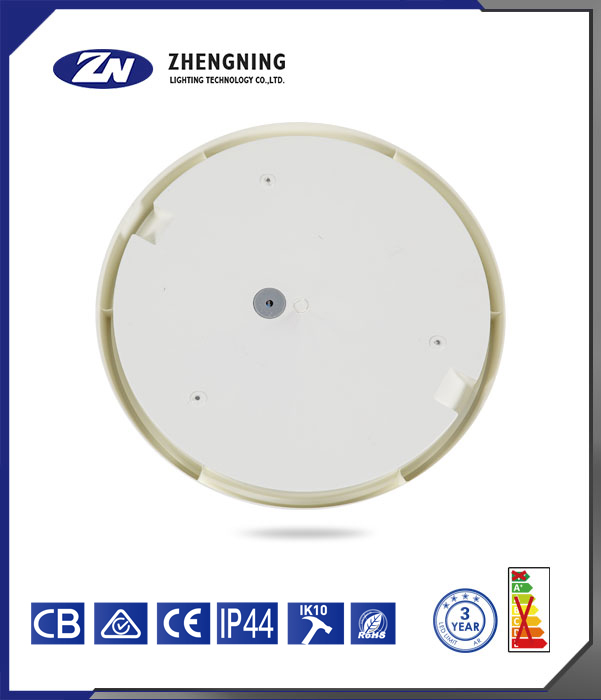 这是正宁照明科技有限公司(ZHENGNING LIGHTING TECHNOLOGY CO., LTD.)生产的灯具。 该灯具整体呈白色圆形,外观简洁。从下方标识可知,它通过了CB、CE等认证;防护等级达到IP44,具备一定的防尘防水能力;抗冲击等级为IK10,能承受较强冲击;符合RoHS标准,较为环保;提供3年的质保期限,且从能效标识来看,能效等级表现较好。